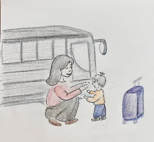 30분 정도 지나 버스가 역에 도착하여 멈추자마자 나는 얼른 앞 쪽의 아이 엄마에게 다가가서 짐을 들어주겠다고 했다. 아이 엄마는 잠시 머뭇거리다가 고맙다며 가벼운 짐가방 하나를 맡겼다. 나는 아이가 낯을 가리지 않을까 걱정도 되었지만, 얼굴에 다정한 엄마 미소를 가득 지으면서 아이에게 한 손을 내밀었다.