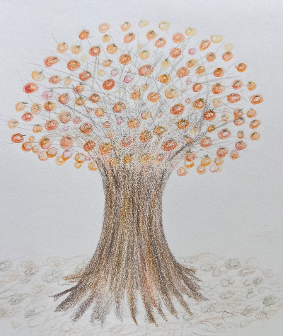 꿈. 이파리 하나 없는 커다란 나무에 주홍빛 감이 한가득 달려 있고 나는 그것을 바라보고 있다. 아름드리나무의 줄기는 굵고 튼실했고, 수관의 모양은 둥글고 아름다웠다. 나무에 주렁주렁 매달린 감들은 주홍빛 꽃송이처럼 화사하게 피어 있었다.