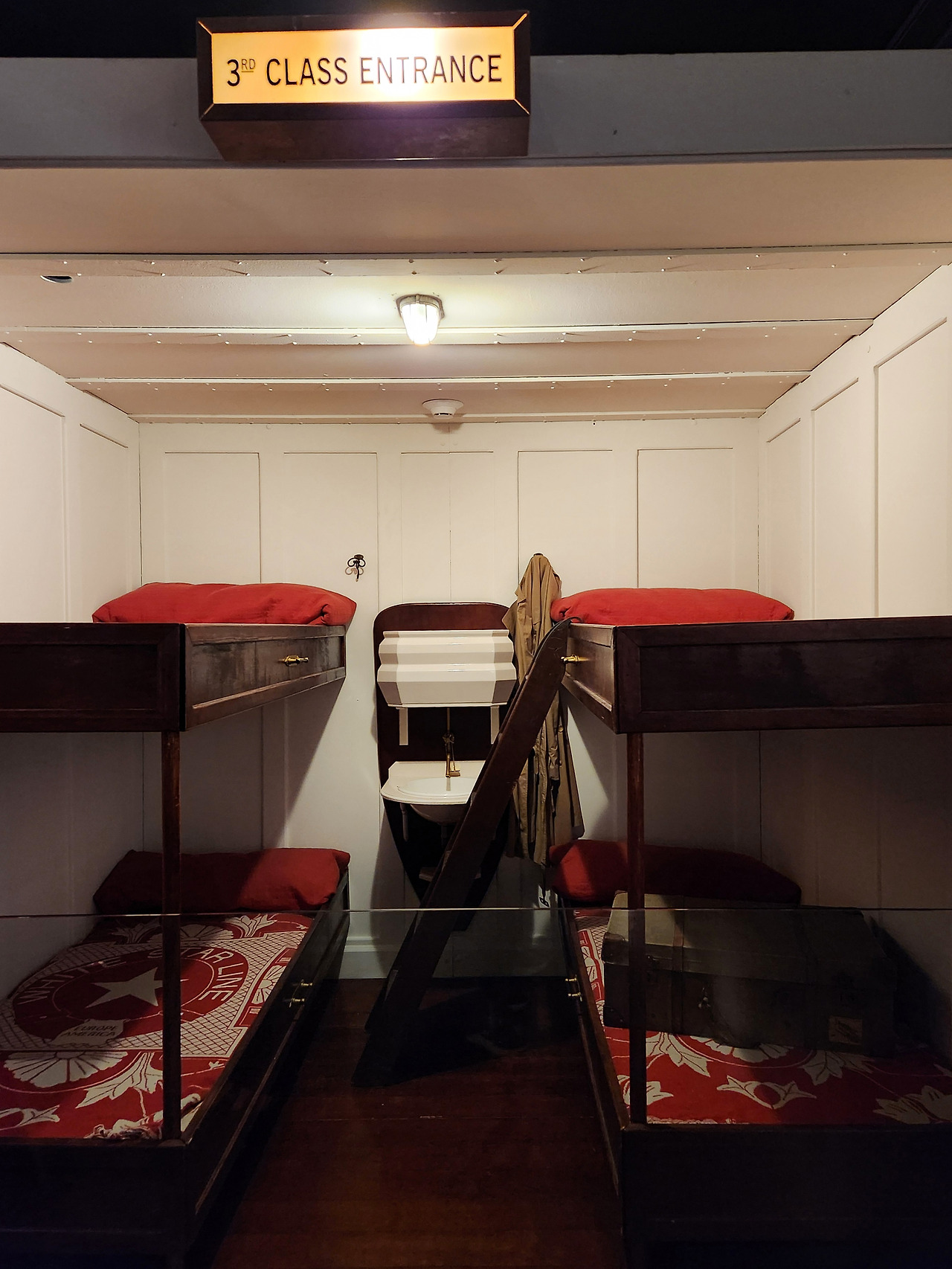 일등석의 60%에 달하는 생존율과는 달리 승객의 75%가 사망한 삼등석 승객들에 대한 전시관에는 초라하고 비좁은 선실이 배에 있던 모습 그대로 전시되어 있고 그곳에서 생활한 승객들의 소지품, 낡아빠진 의복이 주인을 대신해 유리관 안에 누워 있다.