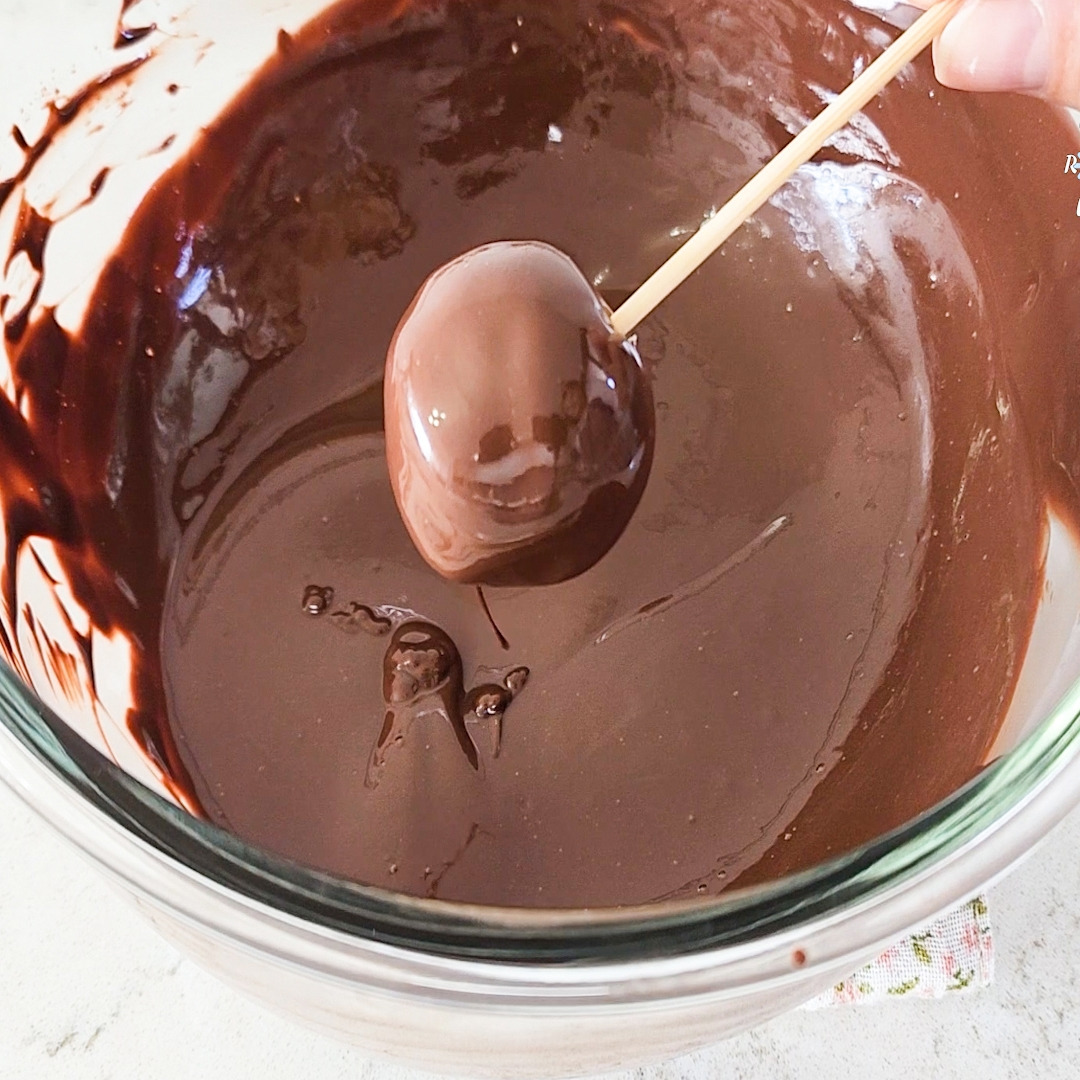 12. 냉장고에서 꺼낸 캐러멜 볼을 초콜릿에 넣었다 빼어 완전히 코팅한다.
