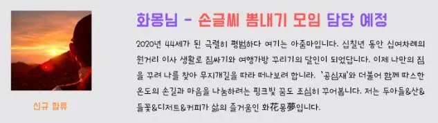 모임의 목적은 독학으로 캘리그래피 작가가 되는 것입니다. 캘리그래피에 관련된 책을 함께 읽고 연습합니다. 작가가 되기 위한 관련된 정보도 주고받고요. 스텝으로 미술을 전공하신 '화몽'님을 모셨어요. 캘리그래피에 운명적 이끌림을 당하셨다고 말씀하시는 화몽님을 잘 따라가면 캘리그래피 작가가 될지 누가 알겠어요. 자, 캘리그래피 작가 원정대에 참여하실 분을 모집합니다.
