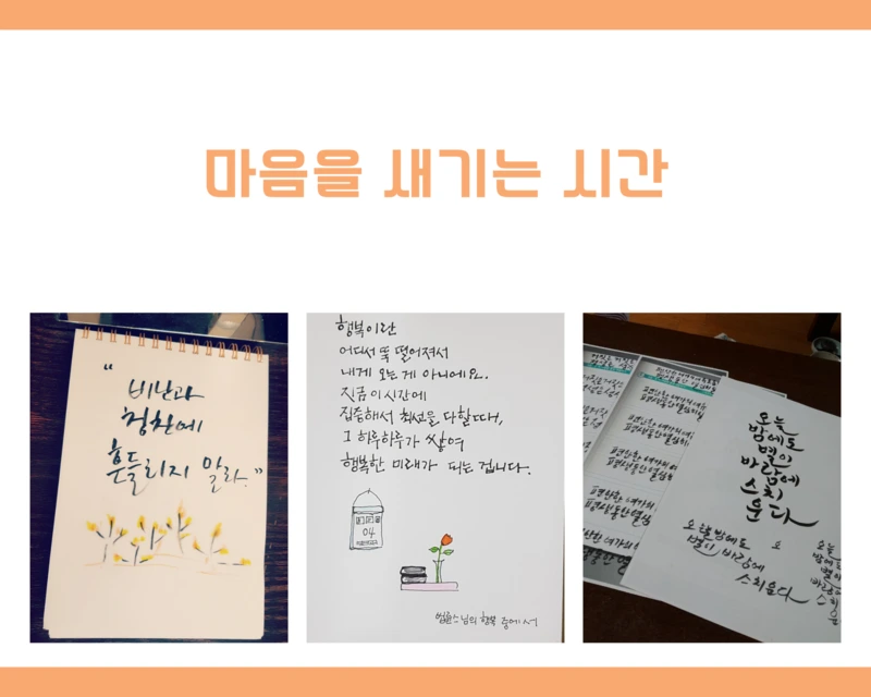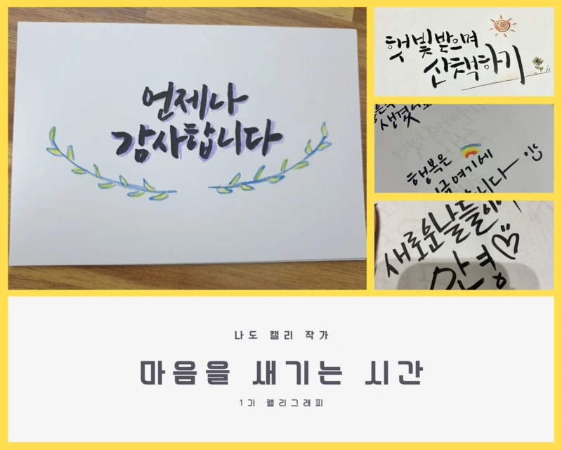 한 달이라는 기간 참으로 짧습니다. 원대한 목표를 이루거나 실력을 대폭적으로 진보하기에는 턱없이 부족한 시간입니다. 하지만 한 달이라는 시간이 쌓이고 마음에 다짐과 연습이 새겨질수록 우리의 실력도 그만큼 비례하여 늘 것이라는 희망이 존재합니다. 잘 쓰면 어떻고 못 쓰면 어떻습니다. 캘리를 경험해보니 쓰는 시간 자체가 마음에 힐링을 심어줬으니 말입니다. 그것만으로도 충분합니다. 번잡한 세상에서, 시끌벅적한 일상에서 잠시 떨어질 수 있었으니 그것만으로도 마음은 이미 감사함을 느낍니다.