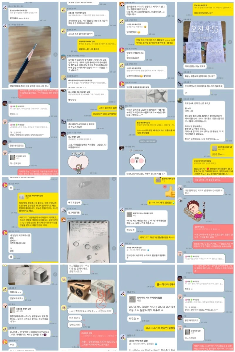 그랬답니다. 오또잉의 첫 과제 알림이 울리기도 전, 대화방에서는 뜨거운 열기가 가득했어요. 12주의 시간이 우리들에게 전해줄 미지의 결과물이 무엇인지를 감히 상상도 못 했답니다. 짧으면 짧고 길다면 매우 지루할 수도 있던 그 시간 동안 함께 웃고 같이 울며 서로를 응원하고 나를 발견해갔답니다. 사실 '오또잉' 여러분을 가장 열심히 궁둥이 팡팡해주신 것은 우리들 자신일지도 몰라요. 처음 계획한 수업인지라 제 욕심이 과했던 것이 사실이었습니다. 더 많으 것들을 알려드리고 싶었고 그만큼 따라오시기 벅차셨을지 몰라요. 그러나 아이들이 잠든 후 또는 새벽시간, 업무시간을 쪼개어 연필선을 쌓고 물감의 색을 올려나간 우리 '오또잉' 식구들. 아실지 모르실지... 저 벅차오르는 감동에 여러 번 눈물을 쏟았답니다. 2021년 봄은 개인적으로 매우 힘들었어요. 그러나 여러분 덕분에 뜨겁게 보낼 수 있었어요. 정말 감사드리고 한 분 한 분의 열정을 존경합니다. 이 글을 통해 꼭 말씀드리고 싶었어요.