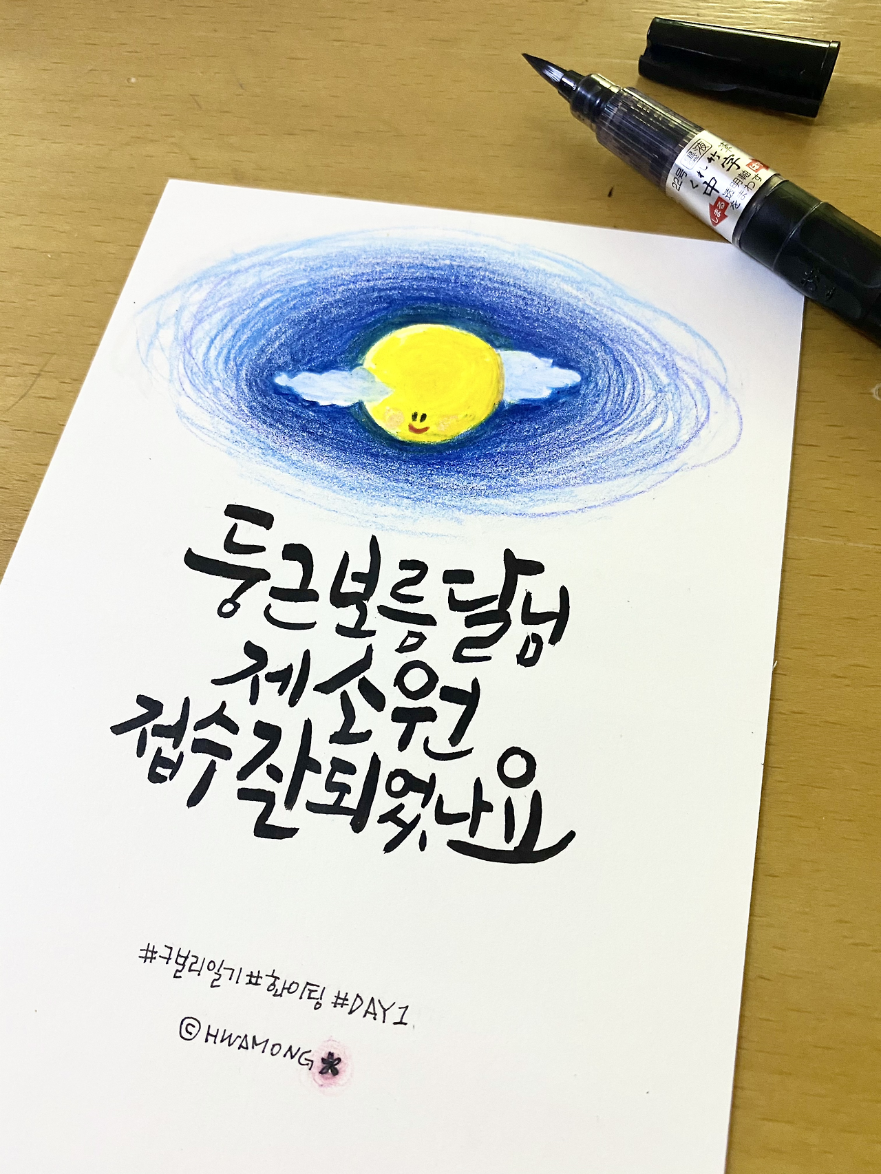 캘리 일기를 쓰려고 한다. 달님에게 기원한 서너 가지 중 하나다. 꾸준함에는 답이 온다고 믿는다. 오늘의 엽서를 파일에 정리하려다 작년 추석에 쓴 엽서를 우연히 보게 되었다. 그때보다는 조금은 나아진듯하니 이 또한 다행이다. 내년 추석에는 좀 업그레이드된 소원을 빌 수 있게 즐겁게 글씨를 그려보자. 하나씩 하나씩 계단을 오르는 거다.
