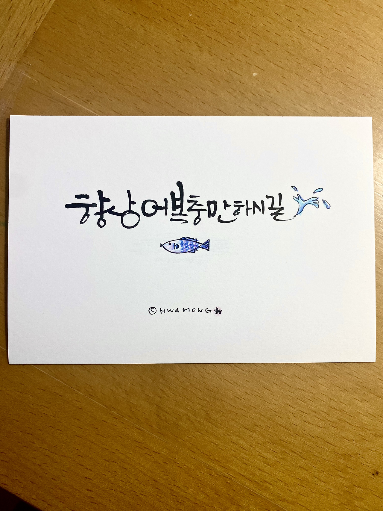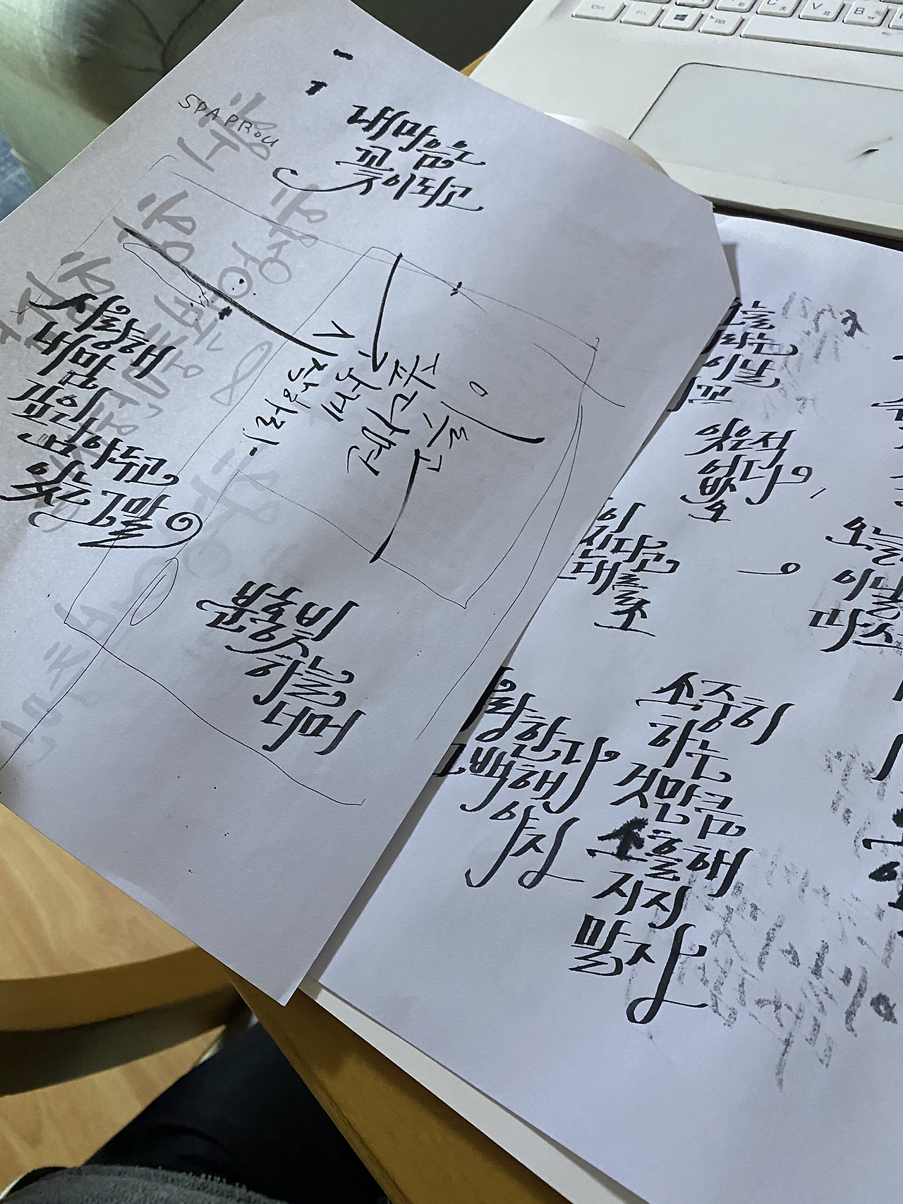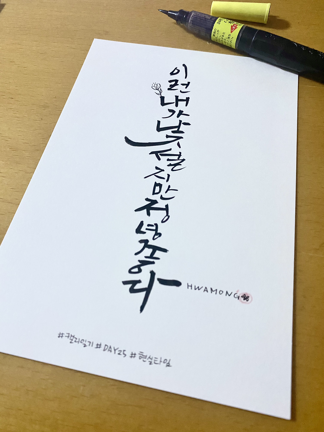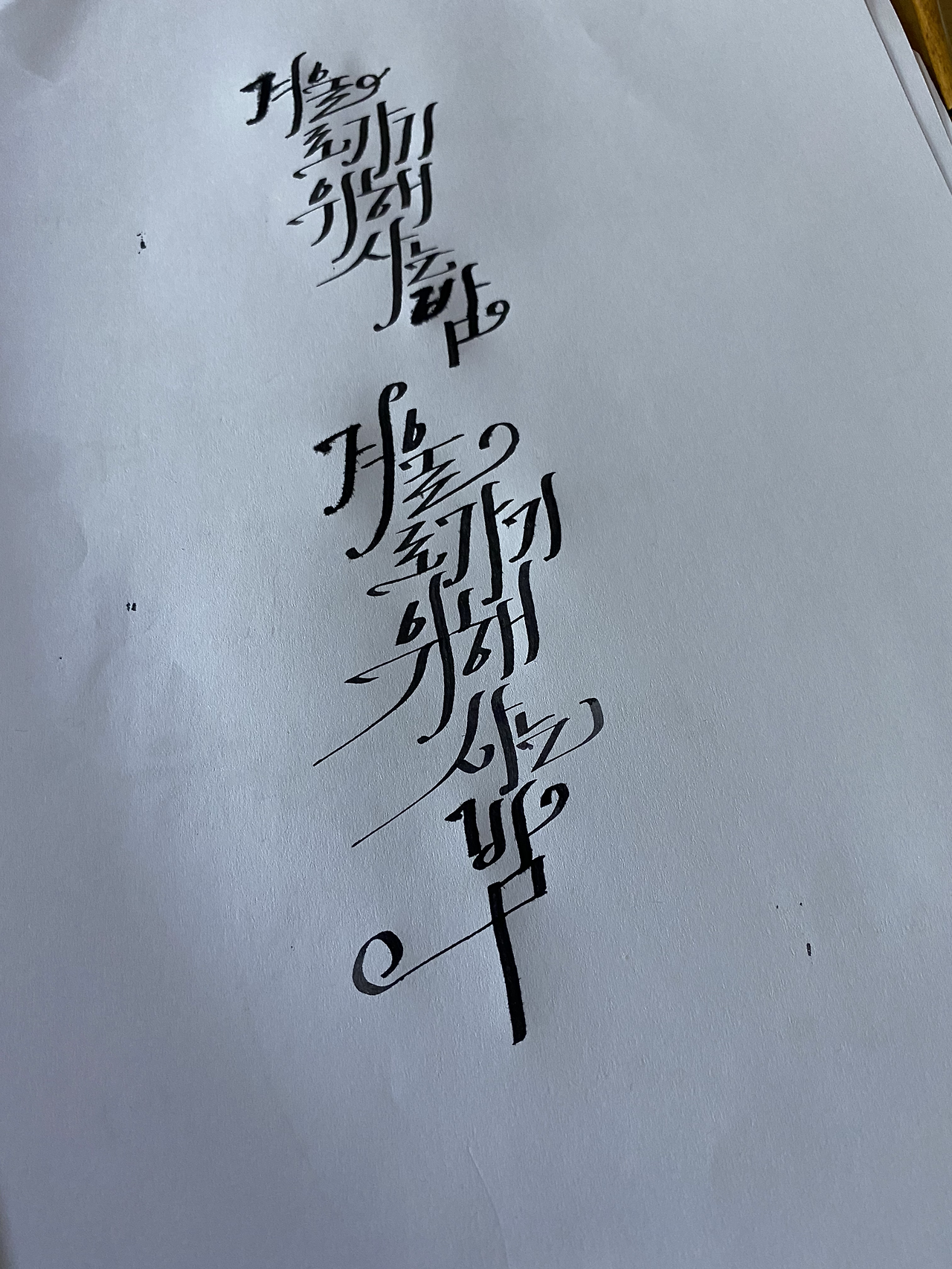 같은 단어, 문장도 읽는 이에 따라 가슴에 각각 다르게 새겨지듯. 무엇으로 쓰냐에 따라 어린 소녀가 어두운 골목의 요부로 변할 수도 있다. 이런 놀라운 변신이 내 손끝에서 시작된다는 것이 캘리그래피와 모든 수작업 끝에 오는 창작물의 매력이다. 거부할 수 없는 마력의 늪에 빠진 김에 더 깊은 곳으로 유영하며 내 세계를 찾아가 보련다.