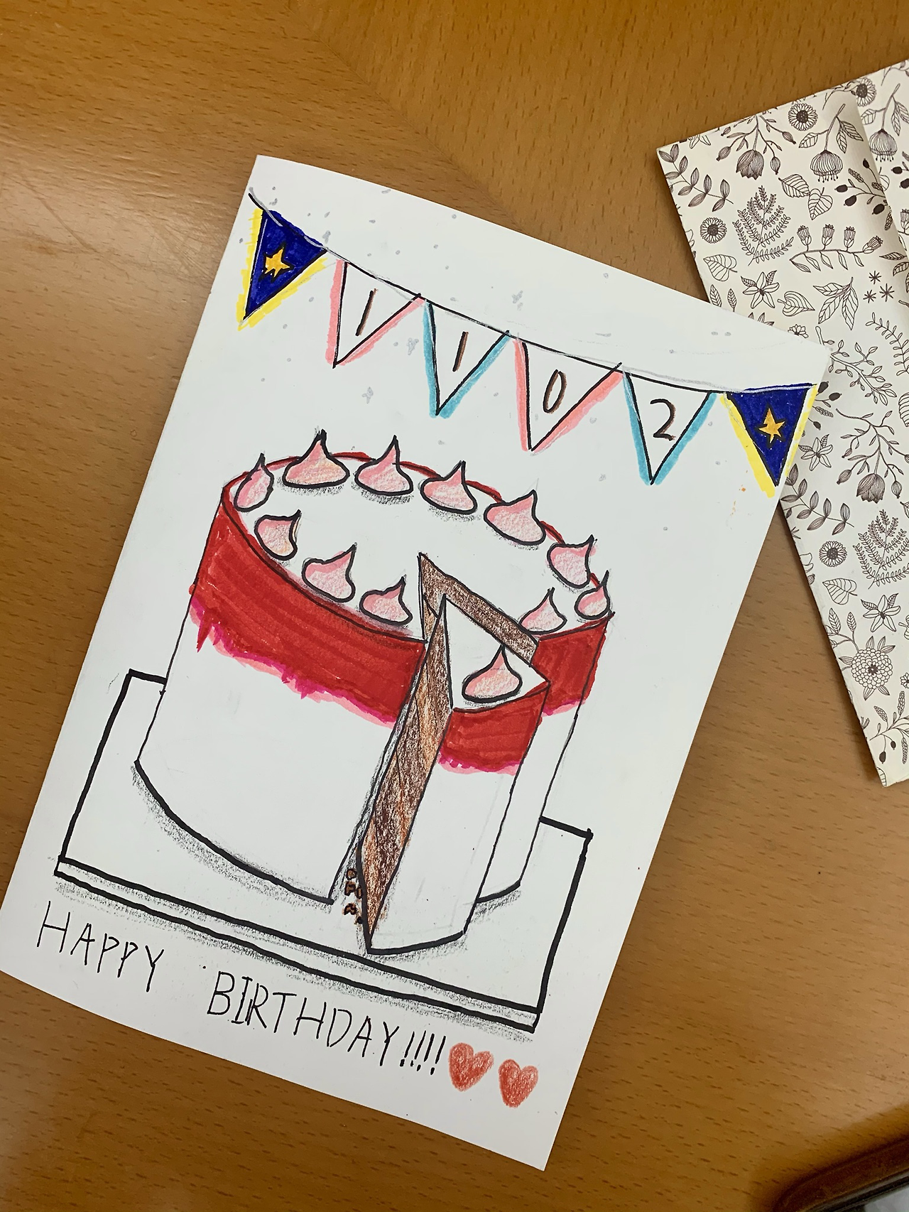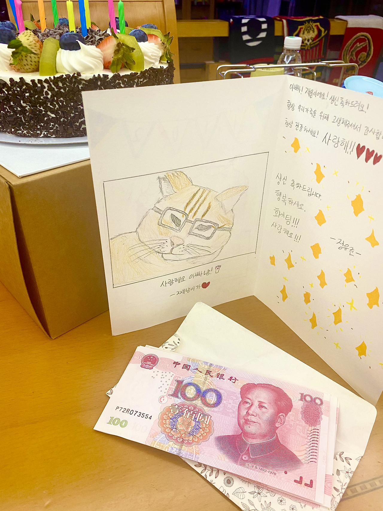 좋아하는 음식과 아이들이 영끌하여 그린 생일 카드.