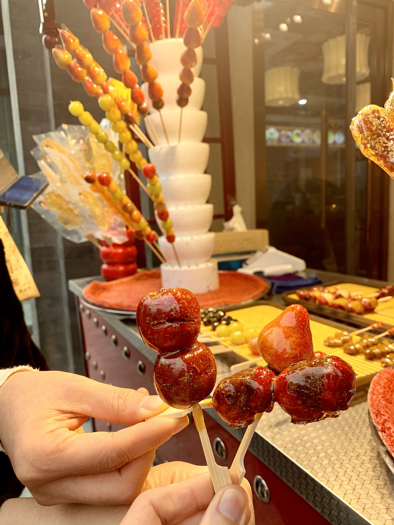 고소한 오리 껍질과 쫀득한 살을 밀쌈에 올리고 춘장을 찍은 파를 함께 돌돌 말아 입속에 쏙. 햐! 맛있다! 같이 온 언니들도 두 손 높이 만세를 부른다. 다른 곳에서 먹었던 맛과 차원이 다르다며 젓가락이 바쁘다. 싹 비워낸 우리는 커피 한 잔을 위해 후통 골목을 지나 전문 대가를 휘저으며 요리조리 살피고 맛본다. 이런 게 즐거움이지. 탕후루 하나씩 입에 물고 까르르 웃는 언니들의 모습에 나도 방긋.