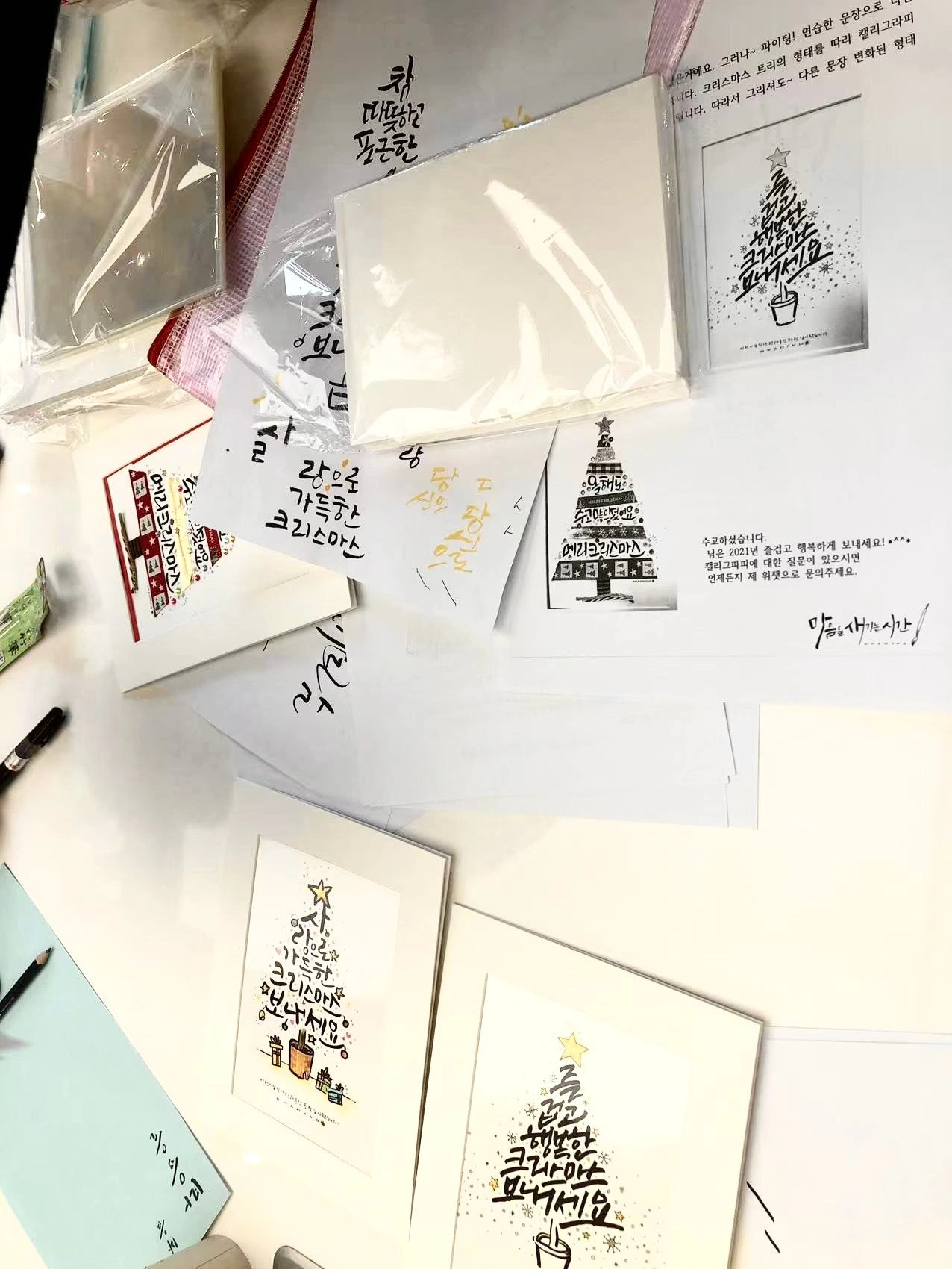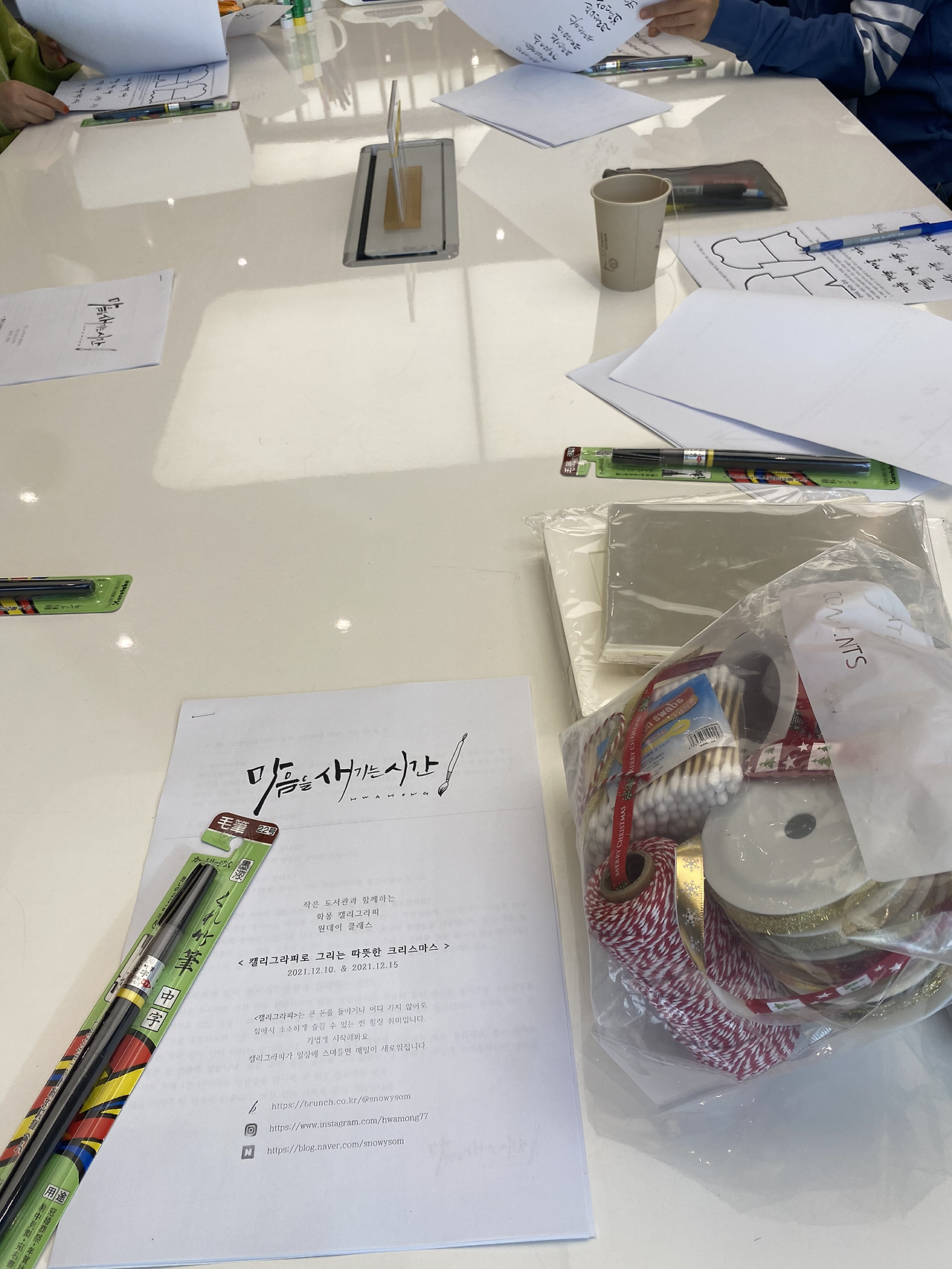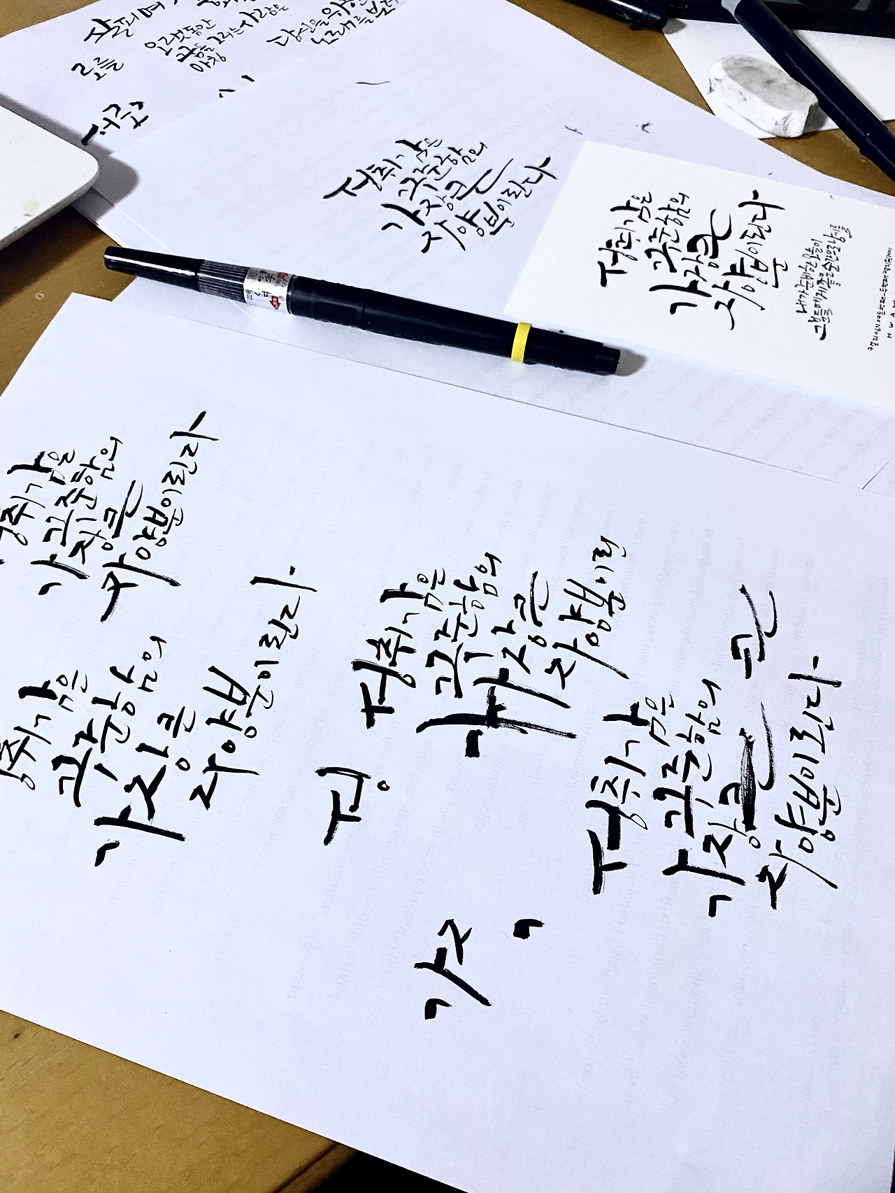 횟수로는 세 번째지만 테마로는 두 번째 캘리그래피 원 데이 수업일. 어제 준비해놓은 재료들을 바쁘게 들쳐매고 집을 나섰다. 지난번 수업 시간이 한 시간가량 더해져 오늘은 정시에 끝낼 수 있도록 하자. 사실 처음 캘리그래피를 접하신 분들이 한두 시간 안에 자신의 글씨를 써낸다는 건 불가능하다. 그래서 원 데이 수업의 포인트는 펜과 조금이라도 친숙해지실 수 있도록 도와드리는 것 이 우선이다. 그다음이 짧은 시간 속에서 하나의 완성작은 만들어 뿌듯함을 느낄 수 있게 따라서 그리시기 쉬운 예시를 준비하는 것이다. 성취감은 꾸준함의 가장 큰 자양분이 된다. 참석하신 분들의 오늘 기억이 좋은 순간으로 남아 캘리그래피로 나를 위한 시간을 만들어 가실 수 있기를 바라며 작은 도서관으로 발걸음을 향한다.