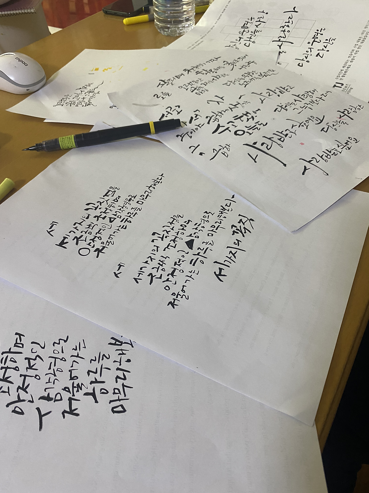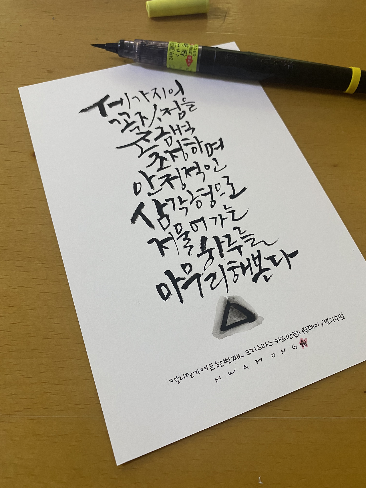 한 해를 마감하며 그 시간을 뒤돌아보나 운동과 캘리그래피, 주부로서의 챙겨야 하는 일정한 일들이 내 하루의 시간표를 빽빽이 만들고 있다. 물론 사이사이 친구를 만나거나 혼자 맛집을 찾아 자전거 페달을 치고 달리던 날들도 있었지만 대부분의 날들의 모양새는 크게 다르지 않았다. 오늘도 이 3가지의 꼭짓점을 조금씩 조정하며 안정적인 삼각형으로 저물어가는 하루를 마무리해 보련다. 매일 그러하듯.