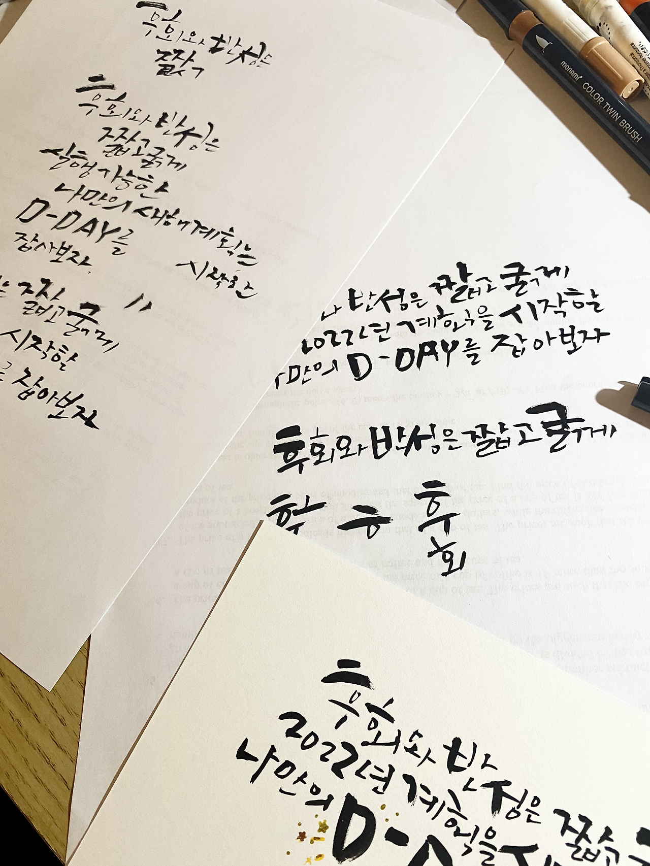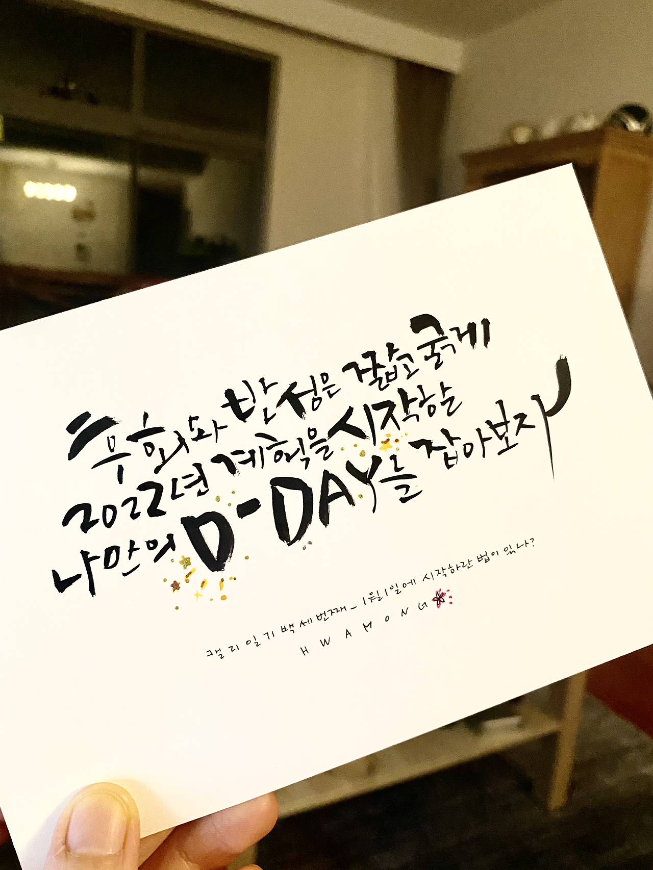 그나저나 지난해 겨울 초입부터 잡아오던 2022년의 계획들이 크게 틀어짐을 어찌할꼬? 1월부터 12월까지 촘촘히 캘리로 살아갈 준비를 하려 했는데. 준비도 못 하고 시작은 언감생심. 아이들 공부 계획에 대해 메모해두었던 내용이 떠오른다. 1에서 4까지의 순위를 정하고 급하고 중요한 일, 급하지 않지만 중요한 일, 급하지만 중요하지 않은 일, 급하지도 중요하지도 않은 일의 순서로 시간을 활용하라고. 이 중에서 가장 신경을 써야 할 것이 급하지 않지만 중요한 일이다. 당장 발등이 뜨겁지 않아 자칫하면 놓쳐버리기 쉽다. 그래서 미리 준비를 하려 한 것을. 후회와 반성은 짧고 굵게 끝내고 시원섭섭한 맘으로 계획을 수정한다. 현실적으로 실행 가능성이 있는 D-DAY를 잡아보자. 1월 1일 시작하란 법이 있나? 내가 의미를 주면 되지. 시작함이 중요하다.