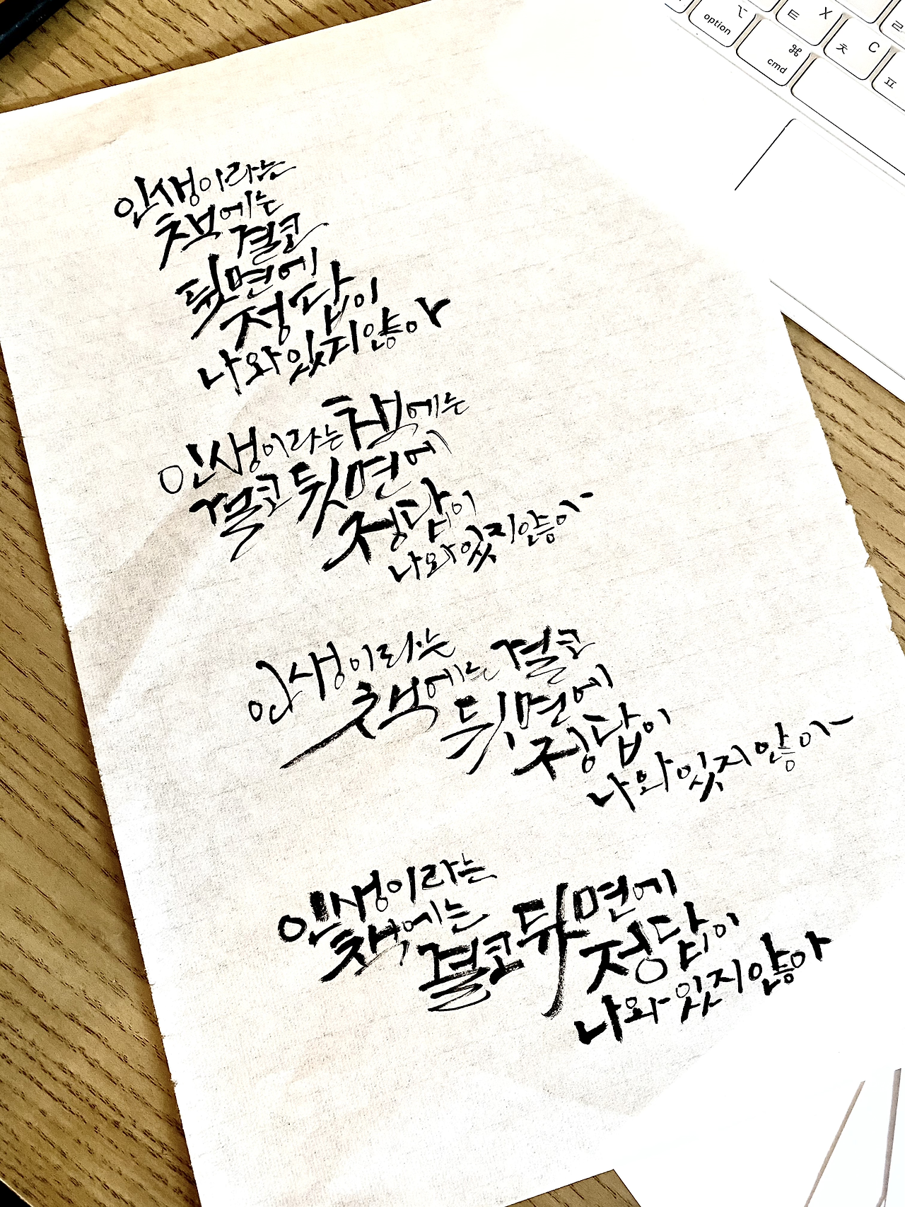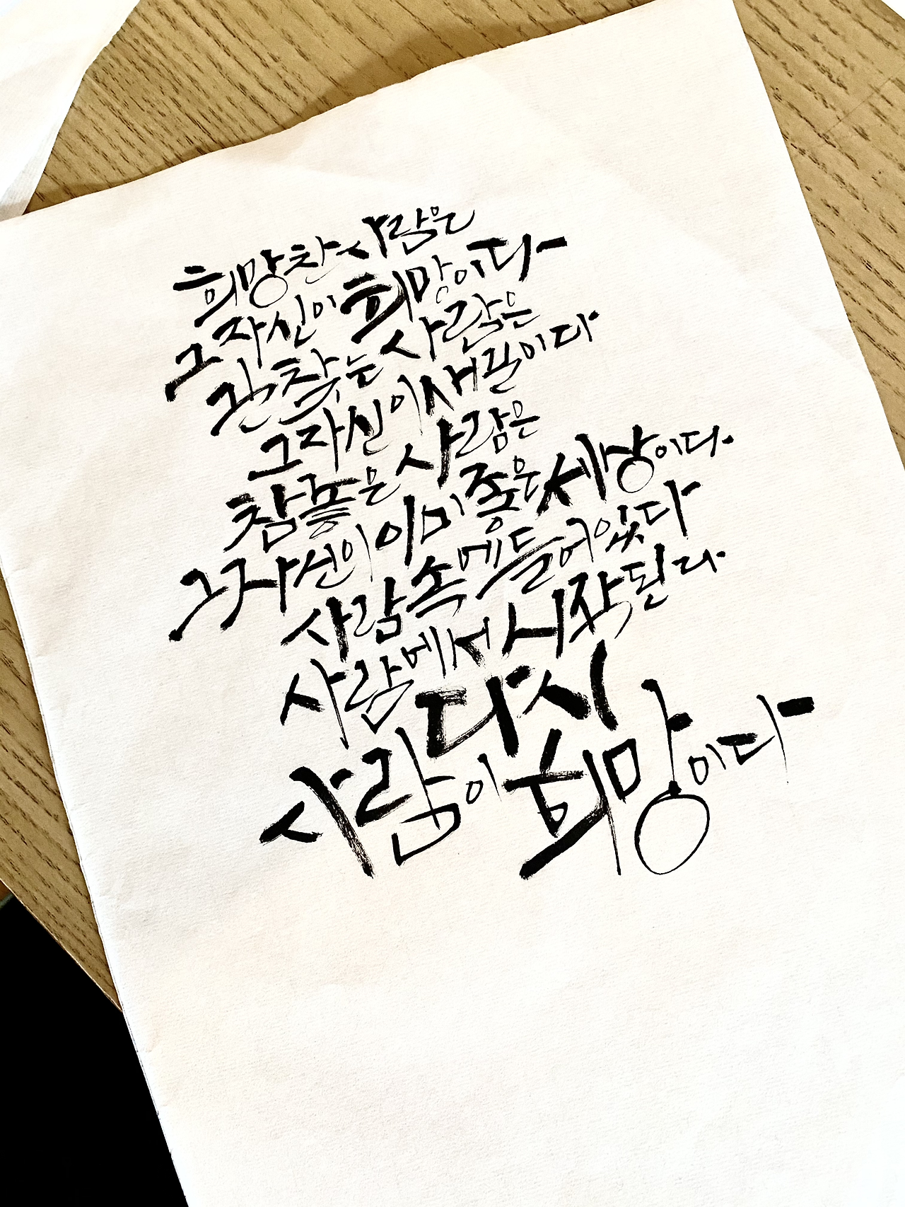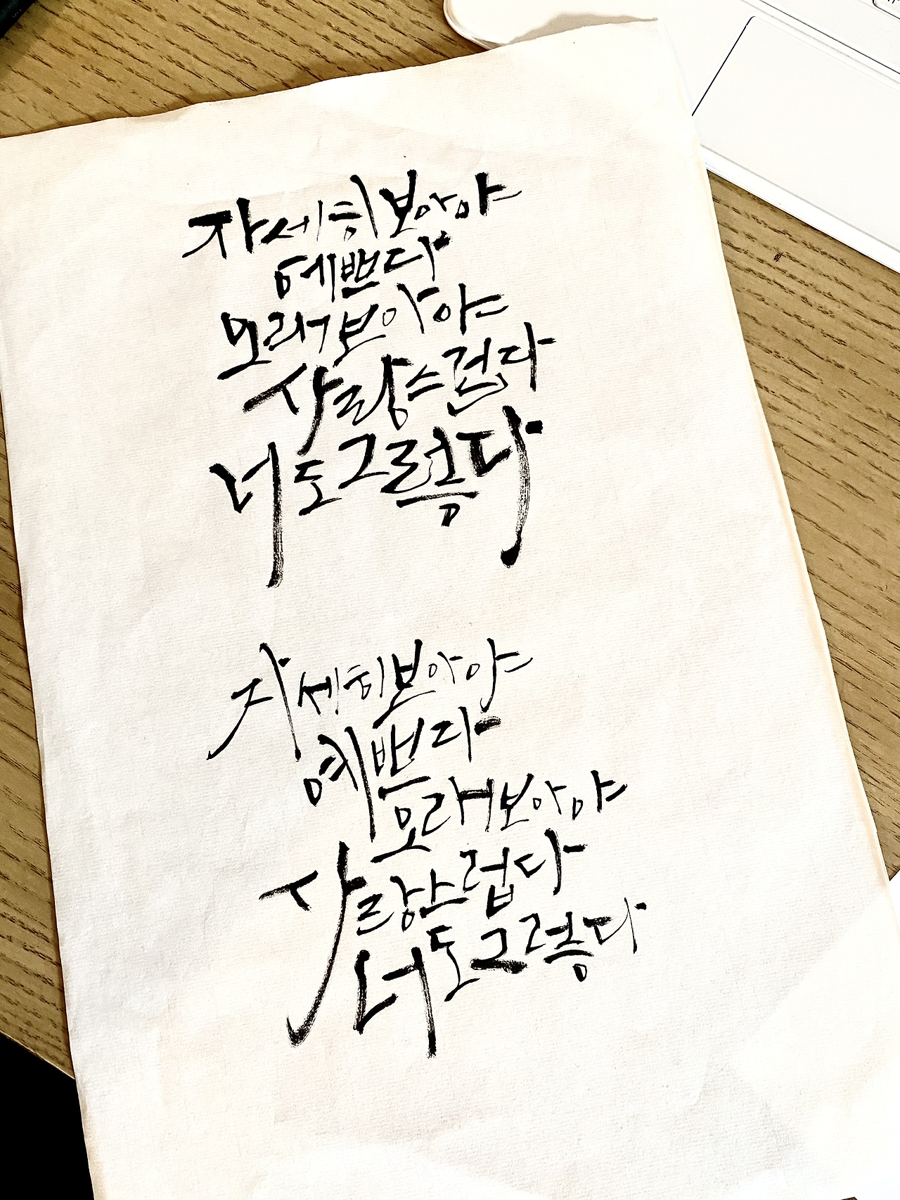 집에 와 식탁에 앉아 잠시 생각에 잠겨본다. 책상 위에 어지럽게 펼쳐져있는 글씨들을 정리하며 마음을 정리한다. ‘그래, 내가 잘할 수 있는 일에 먼저 집중하자.’ 빠르게 정리를 마치고 붓펜의 뚜껑을 열고 종이를 뒤적여 깨끗한 면을 내 앞에 바르게 놓는다. 나는 그렇게 글씨를 쓰고 그림을 그리는 화몽이 된다. 그렇게 내게 맞는 옷을 찾아 입는다.