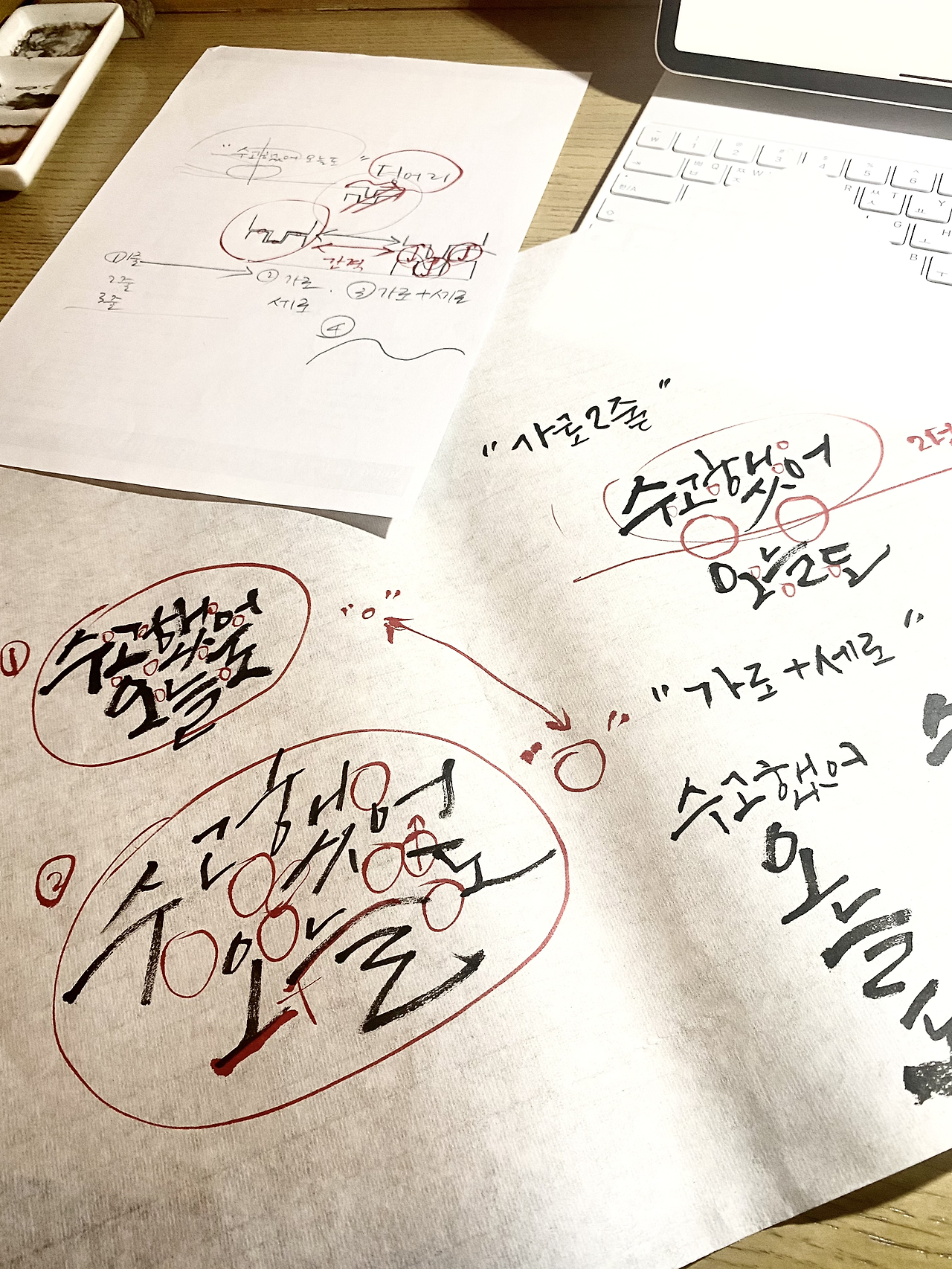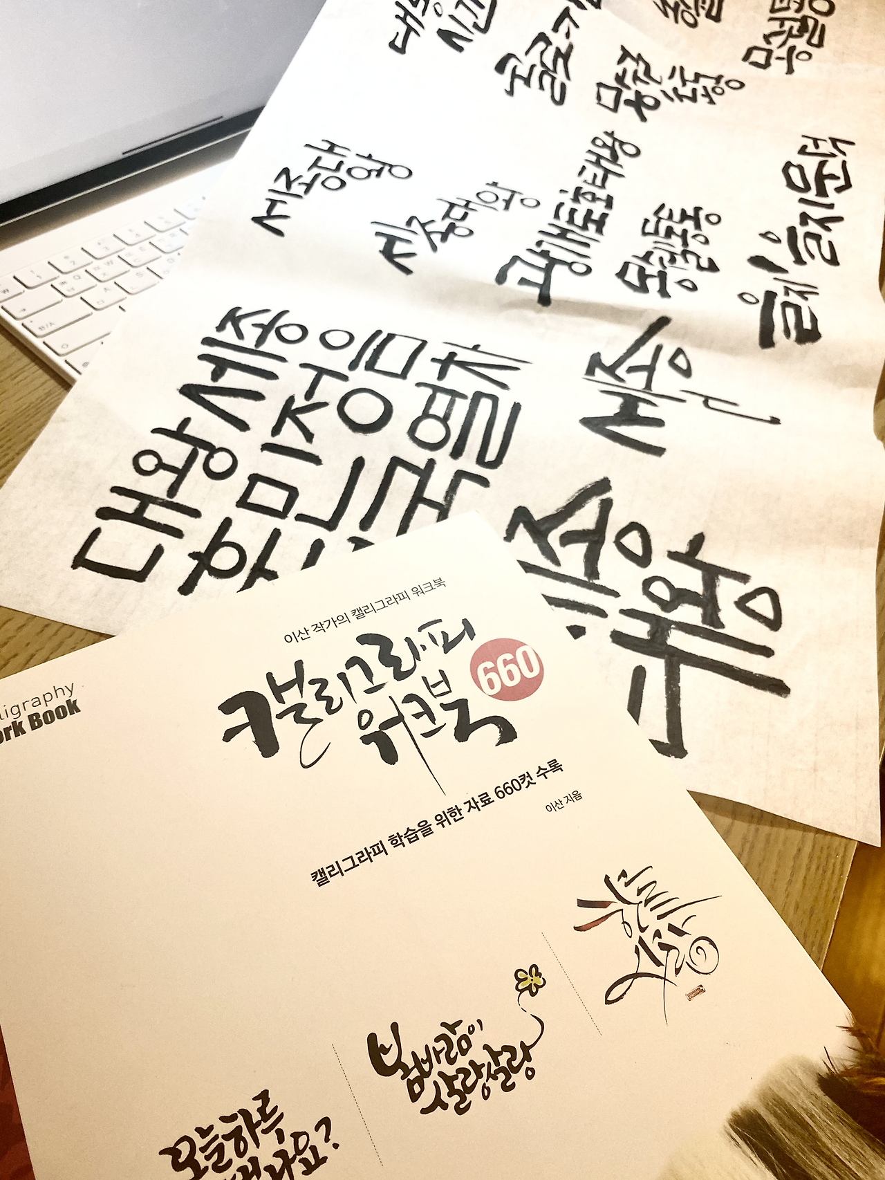 길고 긴 춘절 연휴가 끝난 오늘. 드디어 이산 선생님의 책으로 공부를 시작한다. 처음 책을 받아보고 주르륵 넘겨봤을 때 이산 선생님의 글씨는 대단하다고 생각했다. 그런데 한 줄 한 줄 읽어보며 따라 그리다 보니 완전히 다르다. 좋은 체본 자체가 스승이 된다더니 딱 그 말이 정답. 한 획 안에서 어떻게 붓이 움직이는지 보이니 내가 갈 길이 멀다는 생각이 어깨를 누른다. 그렇다고 기죽을 필요 있는가? 점하나, 획 하나, 자음과 모음을 차근차근 따라가다 보니 즐겁다. 시계를 보니 한 시간이 이리도 지나간다.
