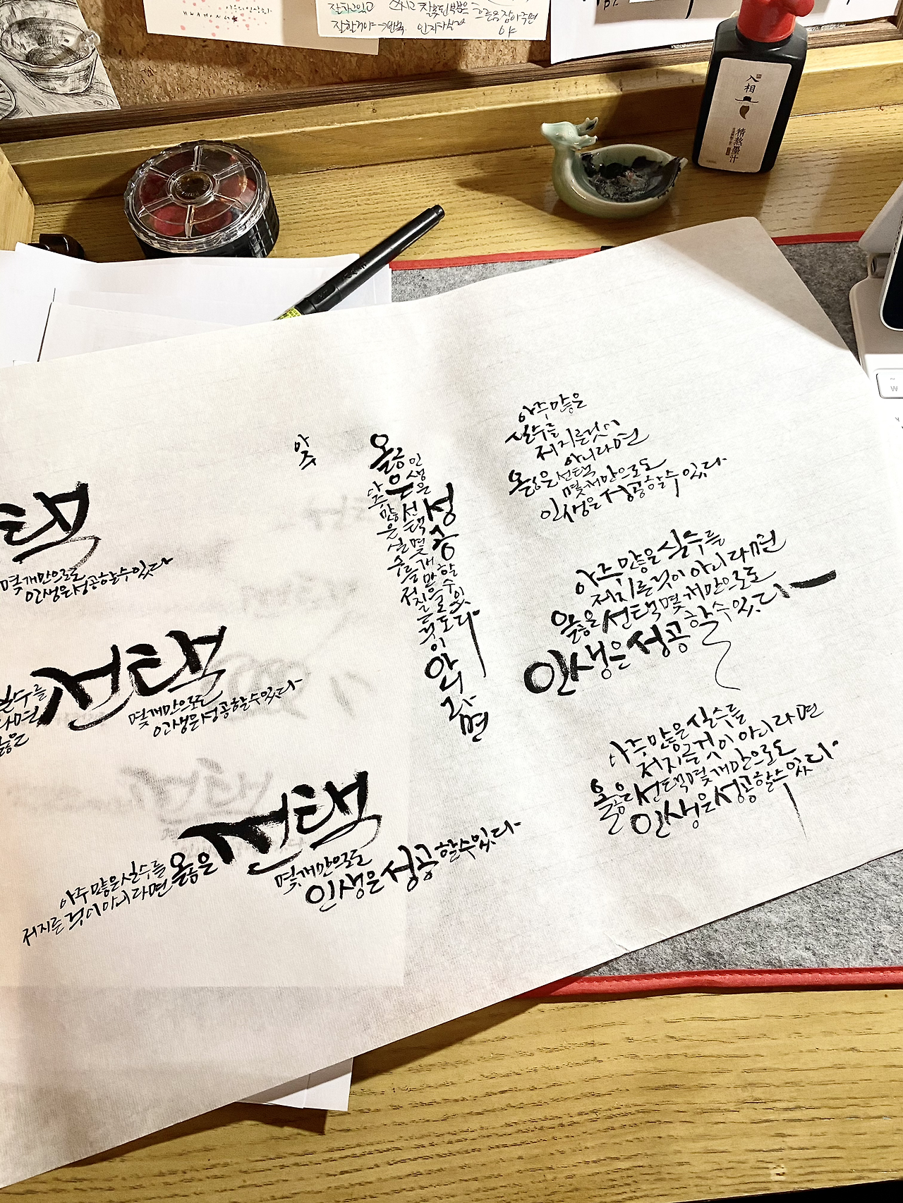 요 며칠 캘리 연습을 제대로 못해 오늘만큼을 열심히 그려보려 맘먹었는데,네스프레소와 LP 청소, 책꽂이 조립으로 하루를 다 보내곤 이제 앉는다. 집중해 보자. 내가 가장 애정 하는 붓으로 나를 그려내는 순간에…