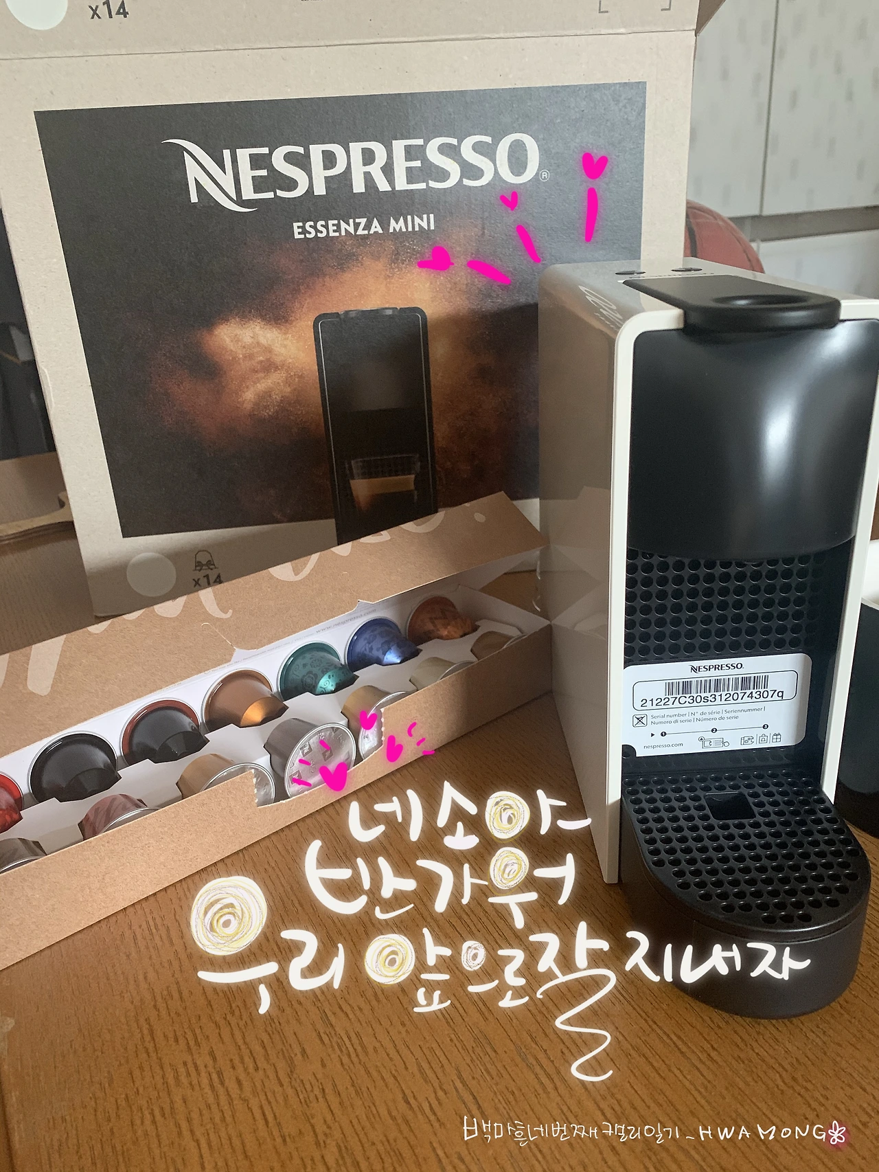 생각보다 자그마한것이 참 이쁘다. 다른 집에서도 여러 번 봤지만 내 것이라 그런지 더 앙증맞은 느낌. 웰컴 박스에 든 커피를 보다가 얼마 전에 지인이 준 캡슐로 얼른 커피를 내린다.