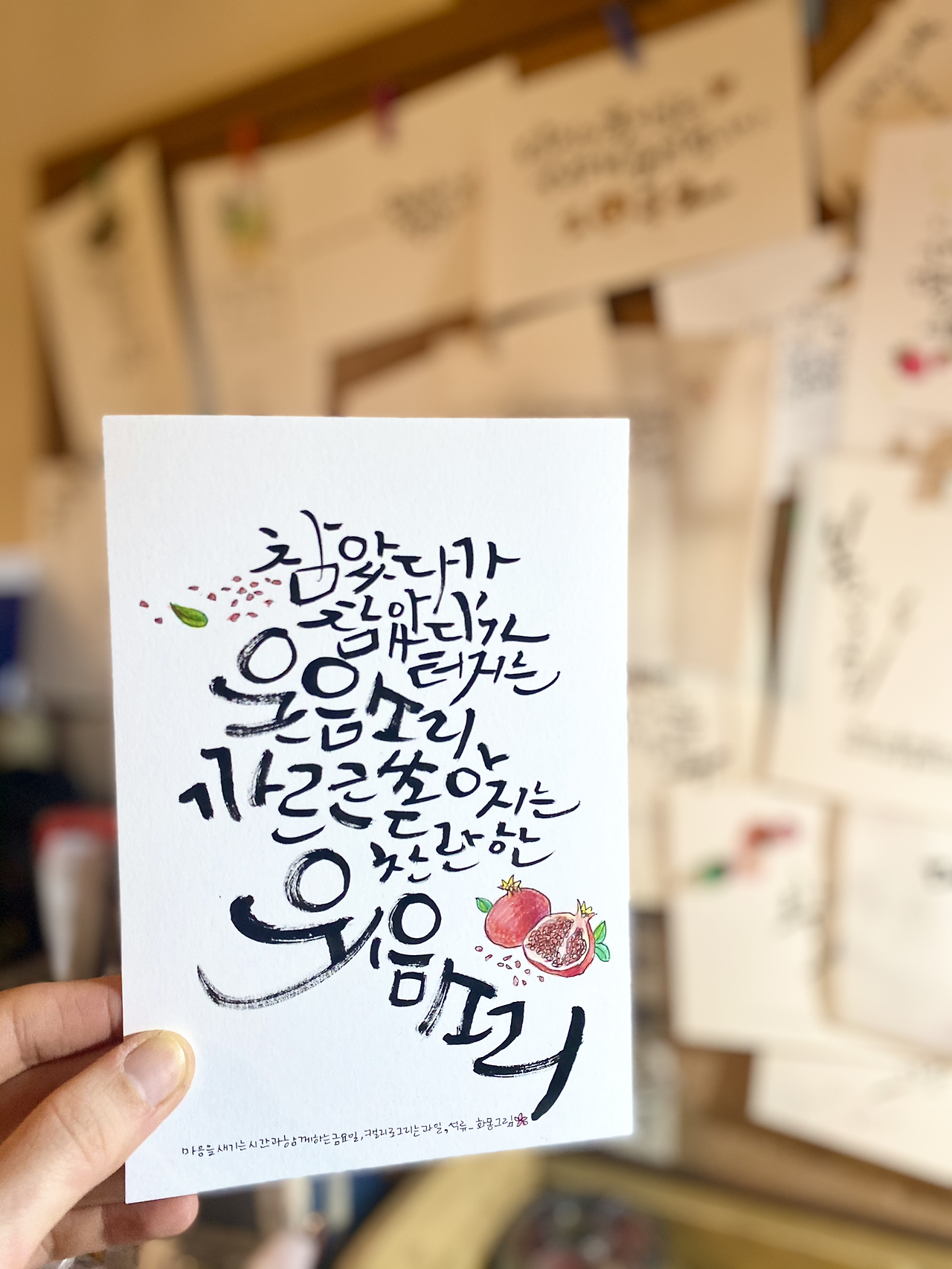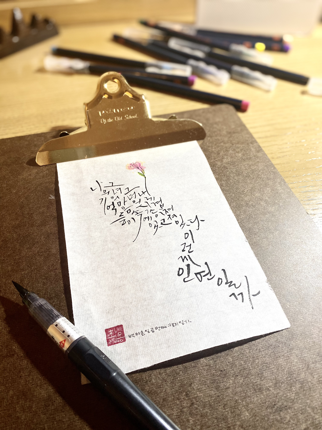 캘리 수업을 마치고 같이 점심을 했다. ‘인연이라는 것이 있을까?’라는 의문을 항상 가지고 있던 내게 ‘있다.’라는 답은 준 만남이 있다. 오늘 수업을 하신 언니와 나의 연결고리가 그런듯하다. 시간의 종과 획의 축 속에 우리 둘이 비스듬히 스쳐 지나간 순간이 있다. 나의 기억들이 그녀의 마음속에 있고 그녀의 시간이 내게 겹쳐져 있다. 이런 게 인연일까? 많이 다르지만 결이 유사한 사람. 인연은 그렇게 자석의 반대 극들이 끌어당기듯 만들어진다. 지어진 이 귀한 실을 잘 이어가는 것이 더 중요하겠지만. 참 감사한 하루.