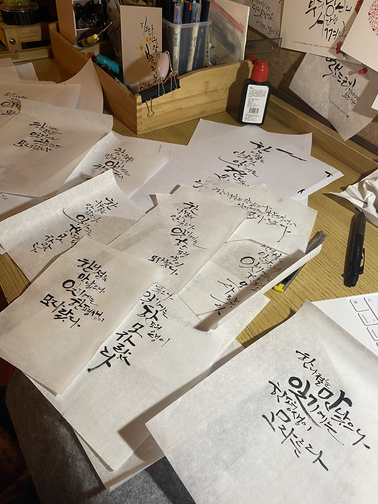 수북이 쌓이는 연습지위에 맘에 드는 글씨는커녕… 쓸만한 글씨를 찾기가 영… 잘 시간이 훌쩍 넘어가는데 이를 어쩌나. 뭐 내일 아침에 다시 써보자!