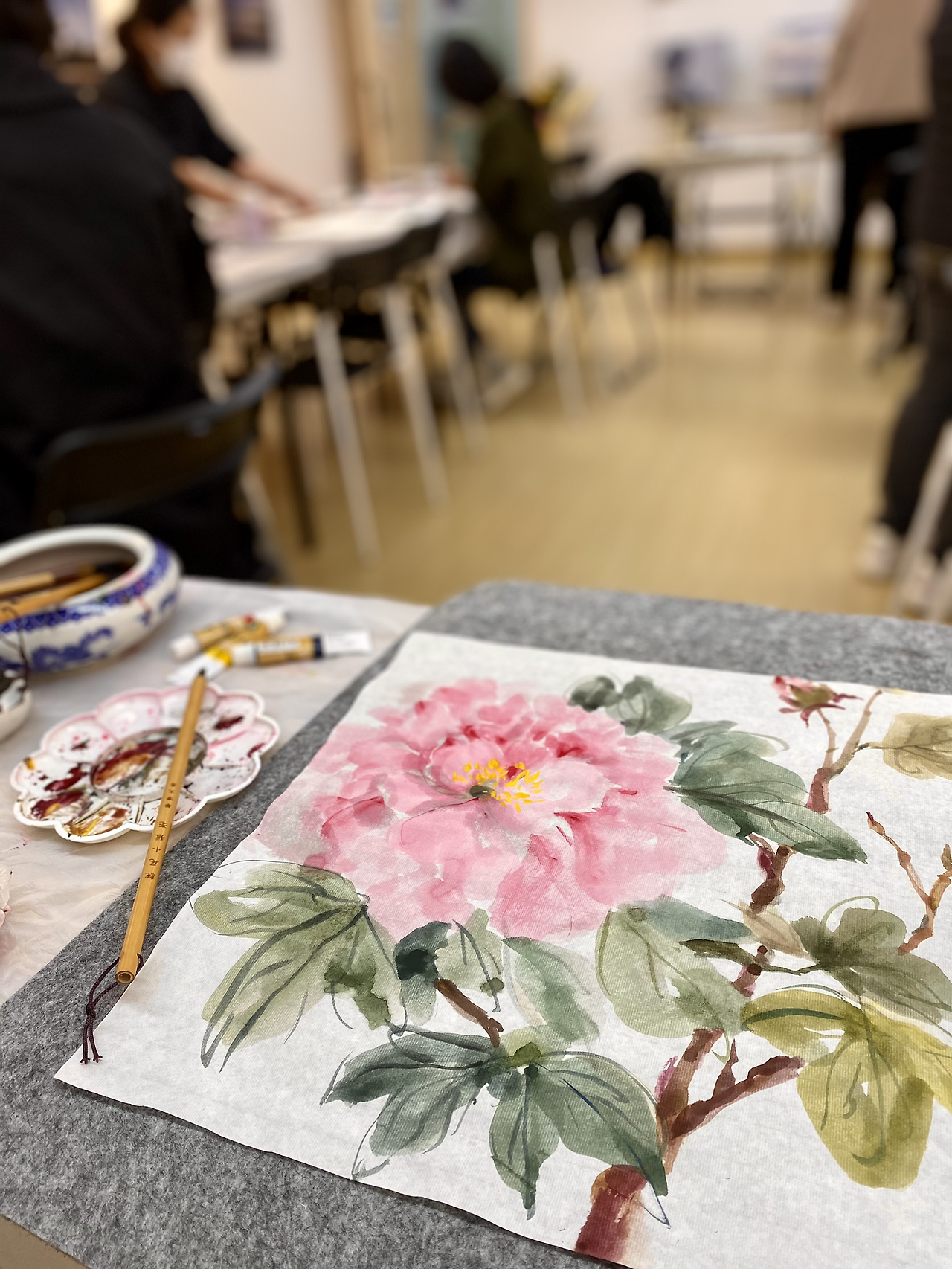 모란의 잎과 줄기 그리기가 오늘의 포인트. 수채화도 그렇지만 동양화나 먹글씨는 몸의 리듬이 중요한듯. 가는 붓을 눕히다가 세우고 멈춘 모를 다시… 우아하게 왈츠를 추는듯 그려야 화선지에 스미는 먹과 색이 은은히 번지며 그 모양새를 갖춘다. 선생님의 시범을 볼때는 아는데 그리기 어려운건 당연한 일. 연습을 해보자며 책에 나와있는 그림하나를 따라간다. 그리다보니 이건 동양화가 아니라 수채화네. 내 맘대로 그리고 있네. 풉.