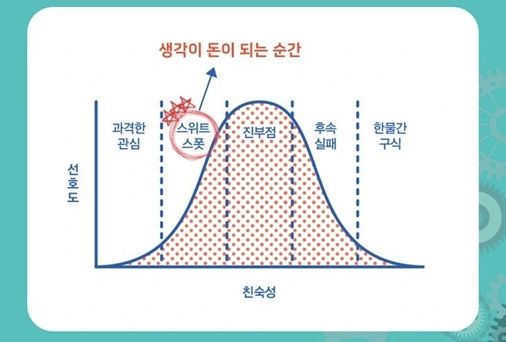 '크리에이티브 커브'는 친숙성에 의해 점점 호감도가 높아지다가 정점에 이르면 호감도가 떨어지는 종형 곡선이다. 이 곡선의 정점인 '진부점'의 코앞에 대중의 혼을 앗아가는 달콤한 순간이 존재한다. 이가 바로 '스위트 스폿'이다. 이 크리에이티브 곡선이 멕시코 만류의 파도처럼 끊임없이 다가온다면 나, 너, 우리는 소위 역사의 한 페이지를 장식하는 인물이 될 수 있다. 이 얼마나 달콤한 달고나 같은 말인가! 누구나! 창의성으로 중무장한 천재가 될 수 있다니! 엘란 가넷은 여기에 플러스 원 아이템으로 천재가 될 수 있는 방법을 4가지로 간단명료하게 설명해준다.