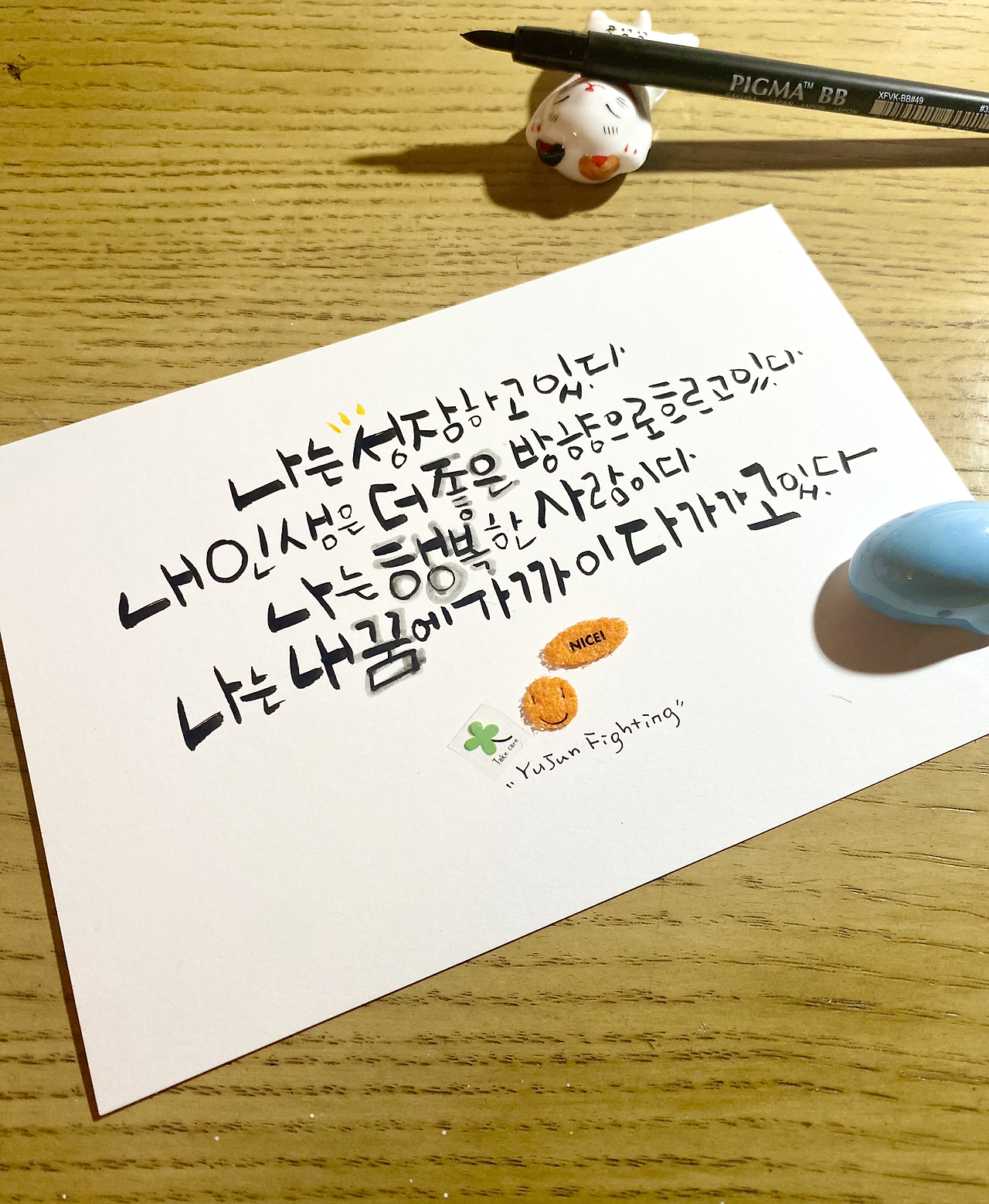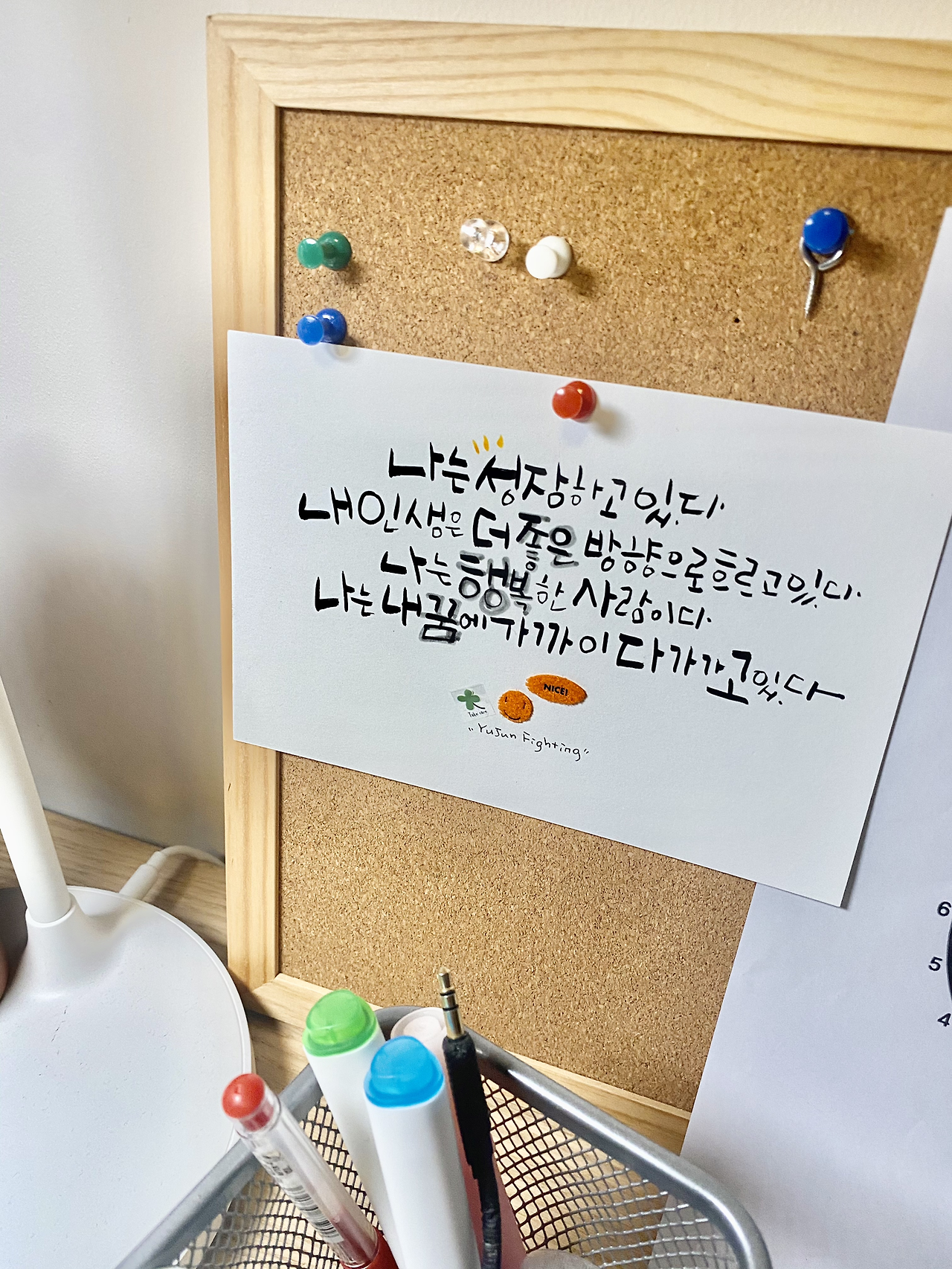 하루 정도 지났을까? 유튜브의 알고리즘이 평소 내게 소개치 않았던 영상을 하나 내놓았다. 평소 같으면 클릭할 일이 없었을 텐데 아이의 학원 문제로 약해진 마음 때문인지 나도 모르게 이미 플레이 버튼을 누르고 보고 있었다. 긍정 확언, 나는 할 수 있다는 믿음을 심는 말의 힘에 대한 영상이었다. 초긍정의 성향이 오히려 단점이 되기도 하는 나에게 이런 동영상에 눈이 간다는 것 자체가 내 마음의 근력이 얼마나 떨어져 있는 상태인지 단적으로 보여주고 있는지도 모른다. 아마 내 일이 아닌 아이의 내일이 걸려 있는 일이라 더 그러할 듯. 십 분도 안 되는 영상의 내용은 사실 나를 믿고 열심히 하면 돈을 벌 수 있다는 내용이었다. 그러면 그렇지… 라며 패드를 닫았지만 내 마음에 작은 돌멩이가 던져진 모양이다. ‘그래, 지금 쭈니에게 필요한 것은 공부 그 자체가 아닐지도 몰라.’ 바로 다시 패드를 열어 몇 개의 문장을 찾았다.