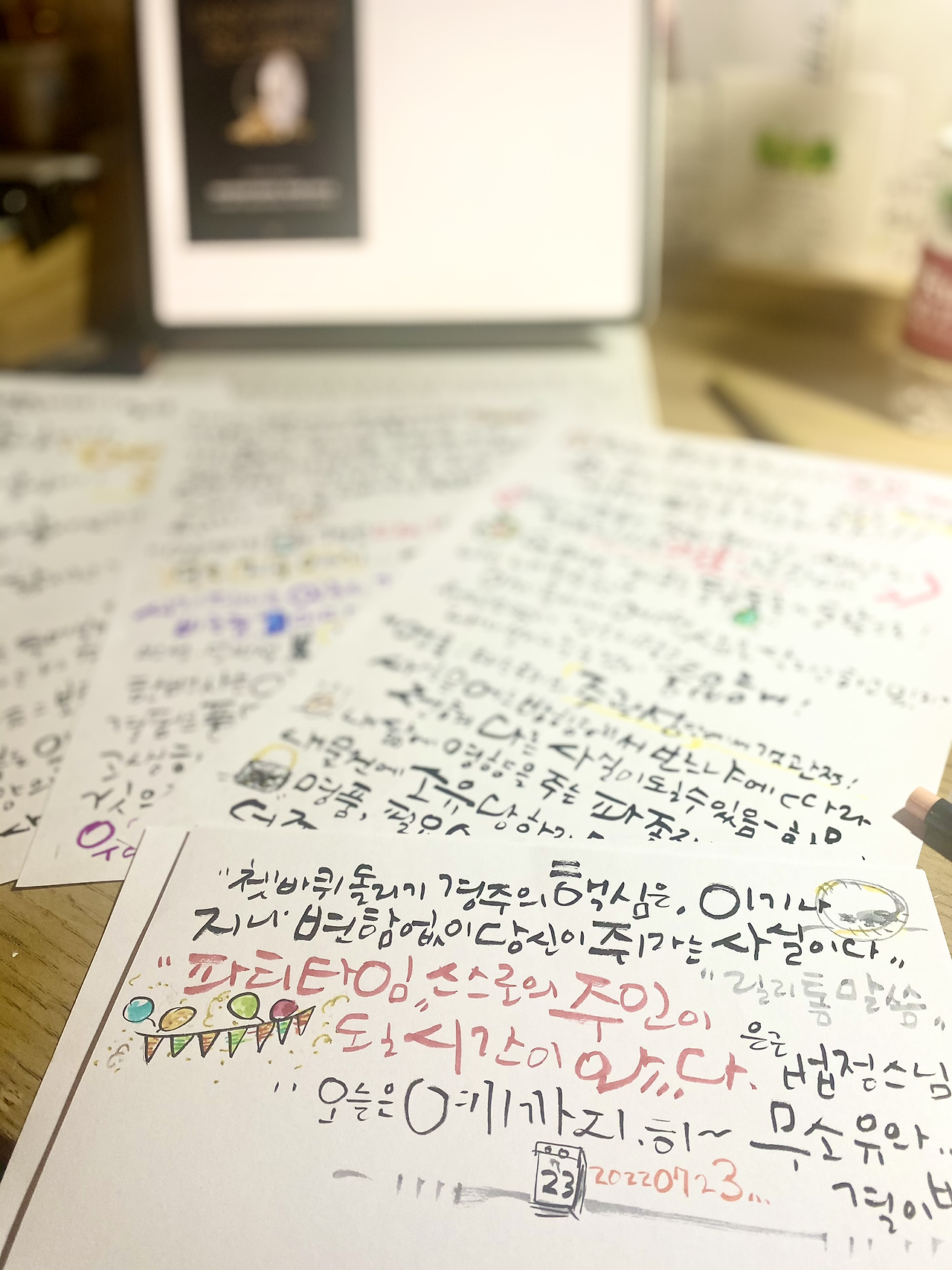 8. ‘비교 면역력’을 키우자. 사촌이 건물주가 돼도 그의 아이가 서울대를 가도 가족이 유명강사가 되어 베셀 작가가 되더라도 나 자신을 믿는다. 내가 나를 사랑하고 아끼지 않는다면 그 누구도 나를 귀하게 여기지 않는다. 캘리작가로 성장하고픈 나는 인스타에서 많은 작품들을 만난다. 좋은 작품을 보았을 때나 작품에 비해 활발한 활동을 하는 쌤들을 볼 때 나의 대응법은 펜을 꺼낸다. 그들의 장점과 숨은 노력과 수고를 유추해본다. 이를 내게 대응하며 부족한 부분을 채워간다. 배 아파할 시간에 내 실력을 키우는 것으로. 그리고 더 중요한 것은 선택과 집중이다. 다 잘하려는 헛된 욕망은 좀 던져버리고 워워하자.