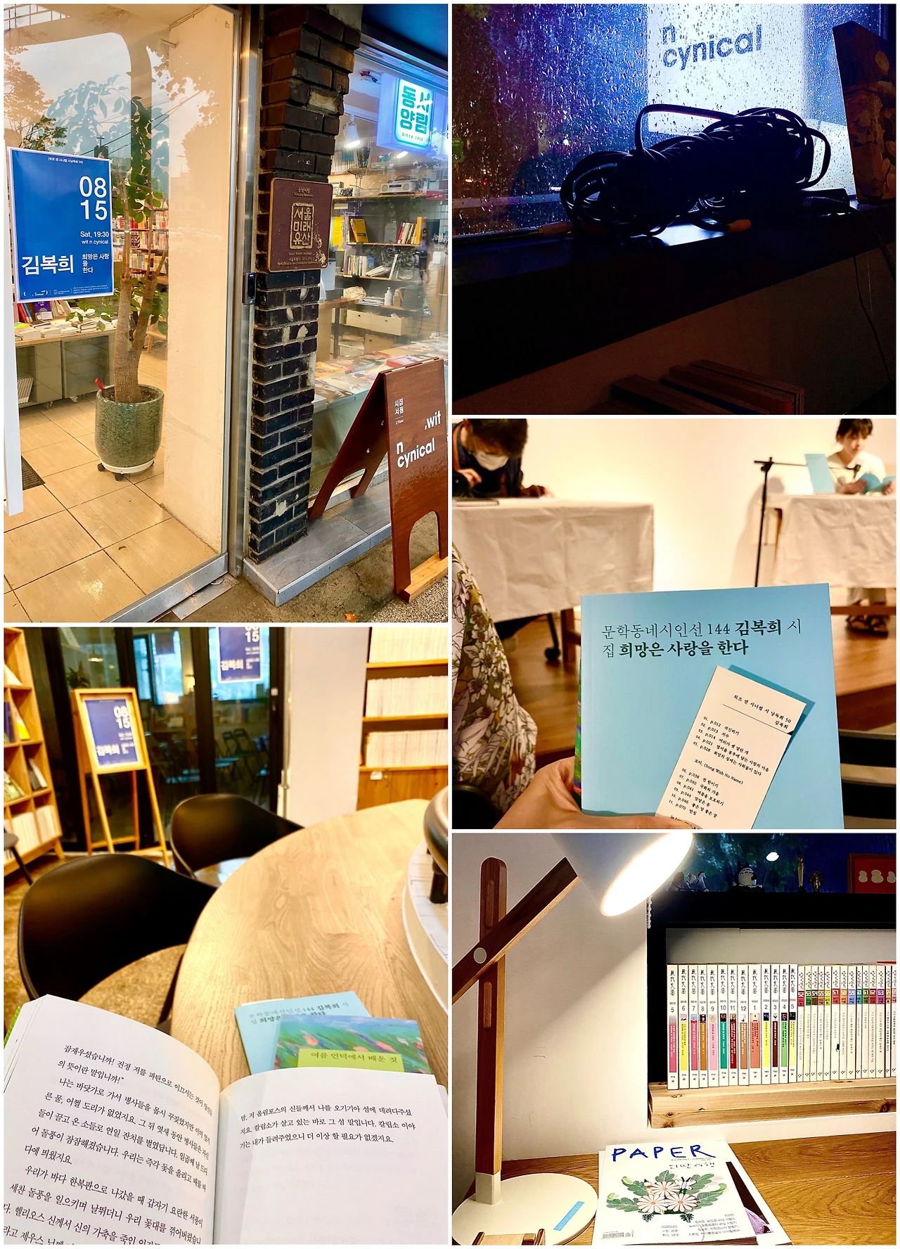 ‘witncynical’ 대학로 동양 서림 이층에 자리한 시를 위한 서점이다. 타임워프를 탄 듯 나선 계단을 흘러 오르면 나타나는 묘한 공간이다. 낭독회가 끝나고 시인의 사인을 받고 시집을 심장 가까이 끌어와본다. 집으로 돌아가기 위해 이 시공간을 나가야 한다. 고맙게도, 누군가 그 걸음에 가을을 가져다 놓았다. 곧 올 가을을 밟지 말고 돌아가 본다. 오늘 같은 한적함마저 즐거운 밤이 다시 내게 찾아오길. 기대해 봄이 좋다. 시에 취한 듯. 긴 장마 덕에 축축한 밤공기마저 즐겁다.