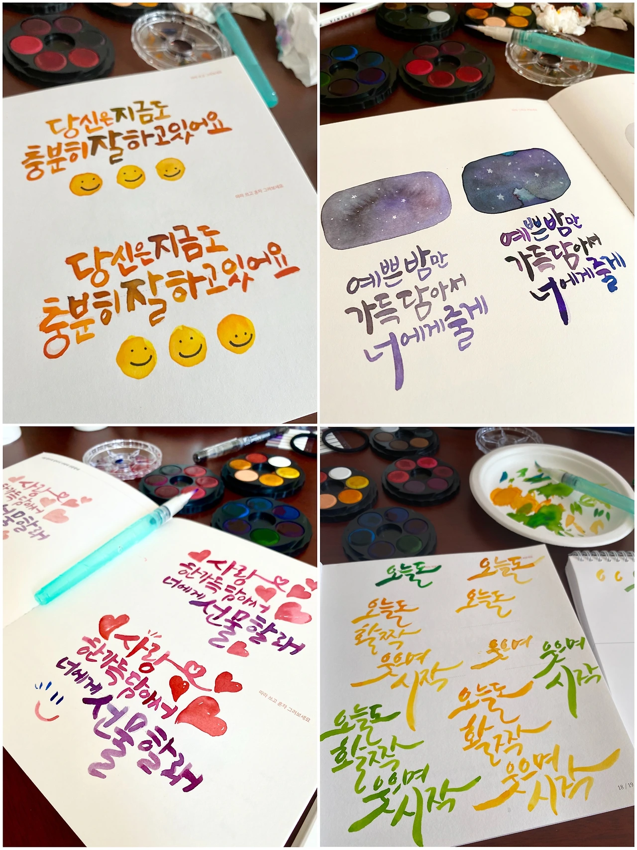 선긋기를 하며 붓펜에 익숙해졌다. 여러 종류의 캘리 펜들을 써보며 다양한 글씨체들을 연습해왔다. 미술을 전공해 수채화에 익숙한 내가 캘리 방 식구들에게 수채 캘리를 시작하자며 슬슬 시동을 걸고 있었다. 모임중 한분이 <수채 캘리愛 빠지다>라는 책의 서평을 부탁받았는데 물감을 써본 적이 없어 서평 쓰기가 고민이라는 말에 부러움을 표했다. 같이 한번 써보자며 내게도 서평의 기회를 만들어 주셨다. 떡 차림 김에 잔치 벌인다고. '마음을 새기는 시간'에서도 수채 캘리를 같이 그리기 시작했다.