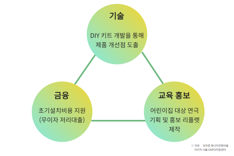 * 어떤 결과를 도출했을까: 첫 번째 전환 실험은 미니 태양광의 기술적 문제를 보완하는 해결책이었어요. 마을 연구원들이 직접 미니 태양광을 조립, 설치해보는 과정을 거치며 사용자 입장에서의 기술적 문제점과 해결 방안을 제시했죠. 지역친화형 금융기관인 동작신협과의 긴밀한 협력을 통해 미니 태양광을 위한 금융상품을 개발하기도 했어요.
