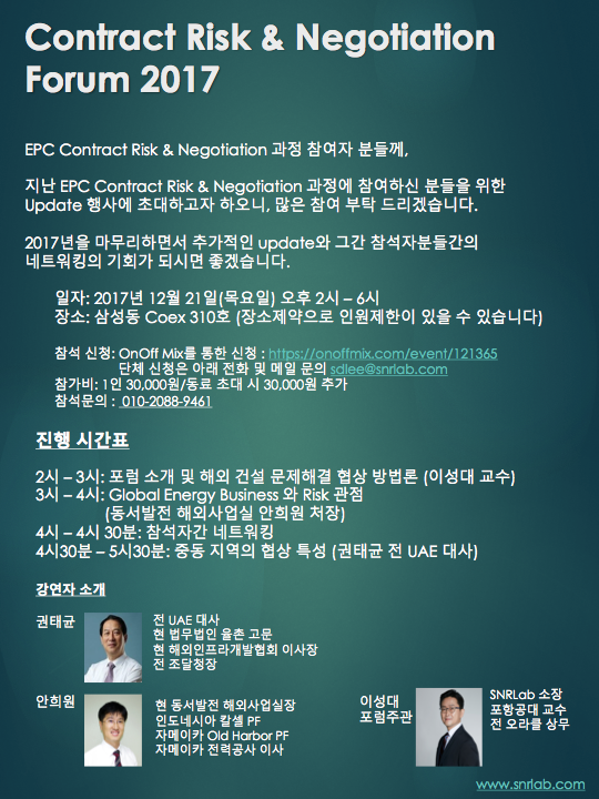 2017년 12월 21일 해외 에너지 플랜트 사업 관련 Contract Risk & Negotiation Forum을 코엑스 310호에서 오후 2시 - 6시까지 개최하였습니다.