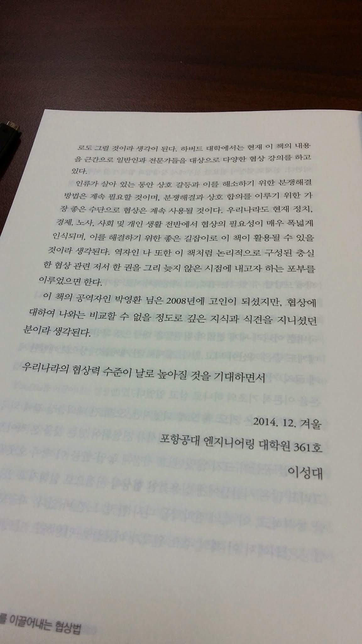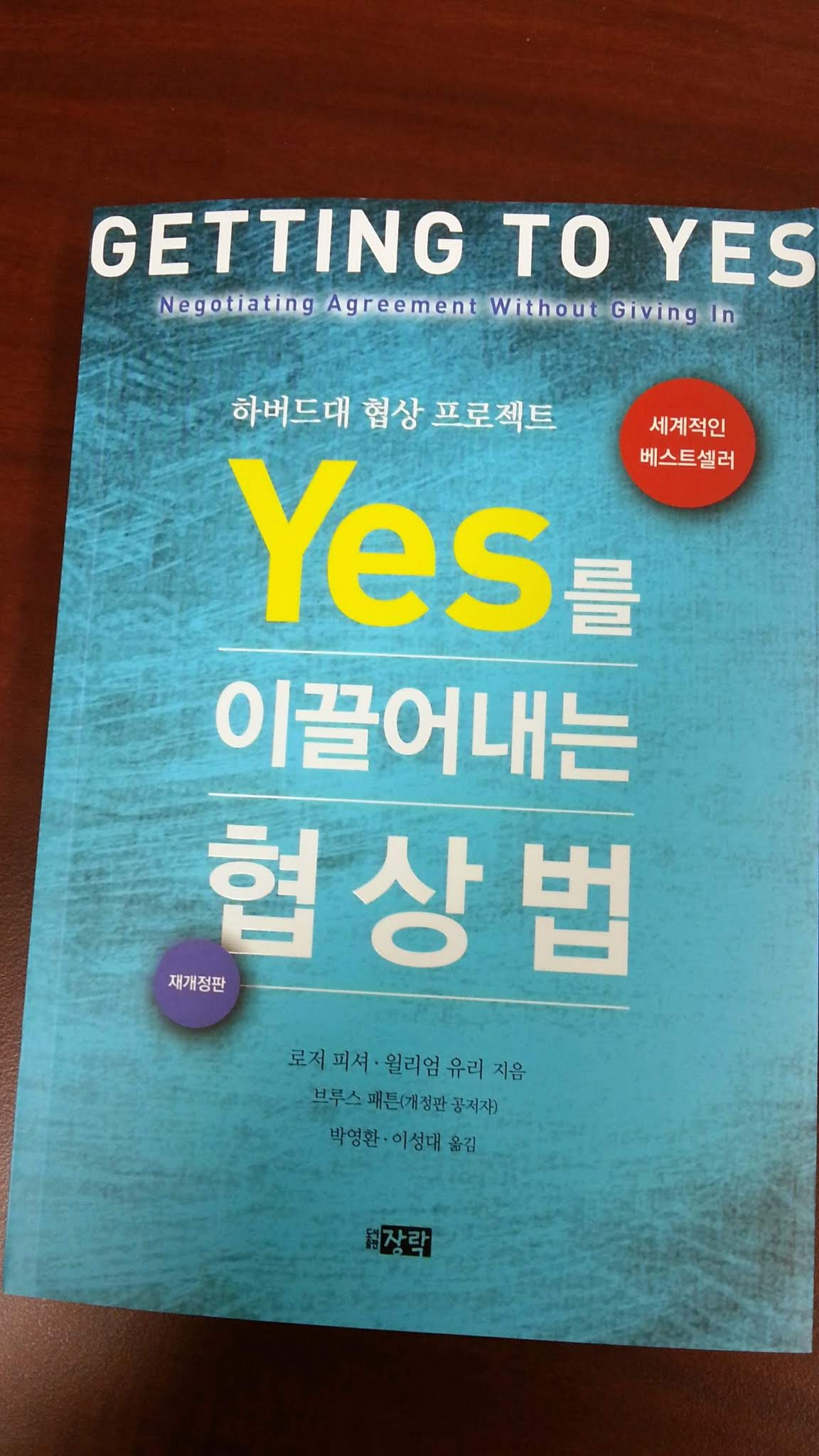 2014년 펜실바니아, 와튼 스쿨의 Executive Negotiation Seminar 에 참석 하기 위해 와 있을 때 "Getting To Yes" 에 대한 한국내 번역판 라이센스를 가진 사장님으로 부터 연락이 왔다.