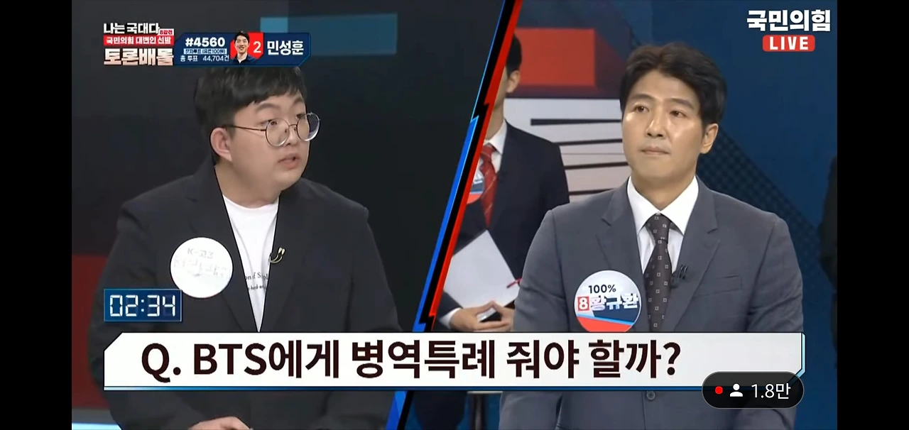 2부는 1:1 데스매치 토론이 진행되었다. 25세 청년의 1급 비서관 승진 논란 토론, BTS의 병역 특례 토론, 공천의 자격시험 토론 등으로 흥미진진한 토론회가 진행되었다. 가장 재미있었던 토론은 1급 비서관 토론의 황규환, 임승호 조 / BTS 병역 특례 토론했던 미필 김민규, 군필 황규환 / 공천 자격시험 토론의 우승 후보 들인 신인규, 양준우 조가 특별히 눈에 띄었다. 이 세 토론은 꼭 눈여겨봐야 한다고 생각한다.