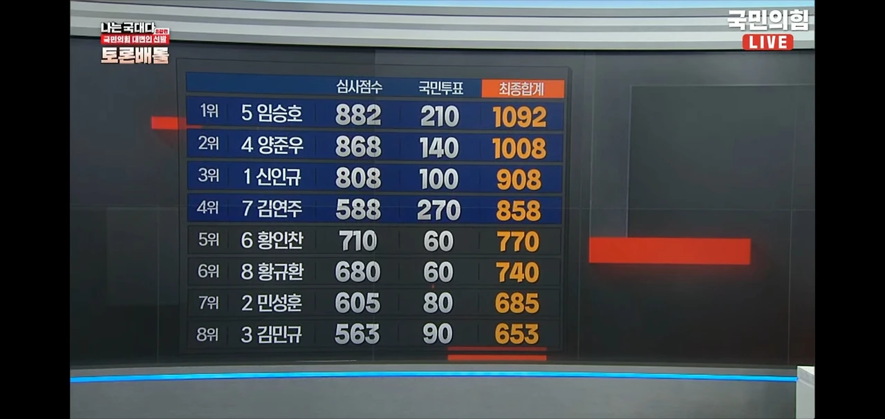 TV조선을 통해 오후 5시부터 라이브 방송이 진행되었다. 각 8명의 후보들은 심사위원 점수 50% + 문자투표 50%를 합쳐서 결승전에 진출할 4명을 선발하게 된다. 처음에는 메인이벤트만 하고 끝날 줄 알았는데, 생각보다 다양한 볼거리를 제공했다. 셀프 세일즈, 발음 테스트, 자기 어필 시간 등 딱딱할 줄 알았던 방송 분위기가 예능 느낌이 나서 보기 편했다. 많은 볼거리를 준비해준 국민의 힘과 TV조선에게 감사함을 표한다.