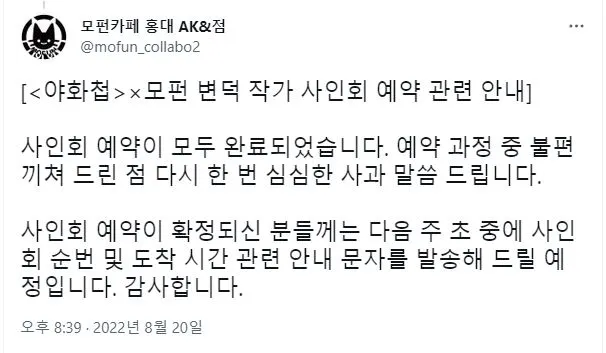 때는 2022년 8월 20일. 트위터에 모펀 카페가 변덕 작가 사인회 관련 공지 사항을 올렸다.