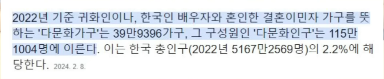 2022년 기준, 다문화인구는 115만 명에 달한다고 한다.