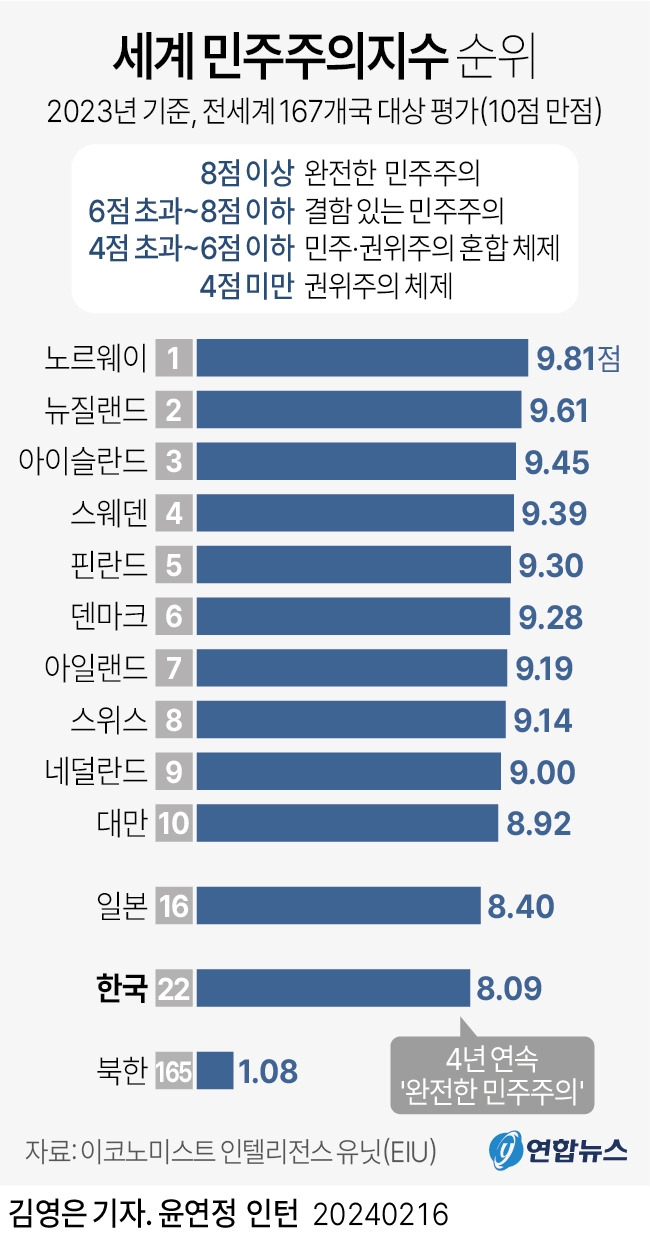 매년 조사되는 세계 민주주의 지수에서는 대한민국이 167개국 중 20위권으로 상위 목록에 속해있다.