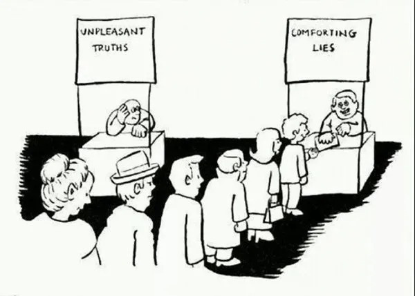 예를 들면 지금 함께하는 연인은 언제든 나에게 이별을 통보할 수 있다. 회사는 개인이 필요 없다고 판단하면 권고사직이나 해고를 결정할 수 있다. 국가는 전쟁 같은 대형 사건이 발생하면 개인에게 희생을 요구하며 애국심을 강조한다. 사람들은 이러한 현실을 알고 있음에도 불구하고 모르는 척한다. 즐겁고 행복한 순간이 영원히 지속될 것이라는 착각 속에서 안주하며, 불편한 진실을 외면하고 자신에게 유리한 거짓된 희망만을 좇는다.