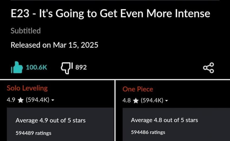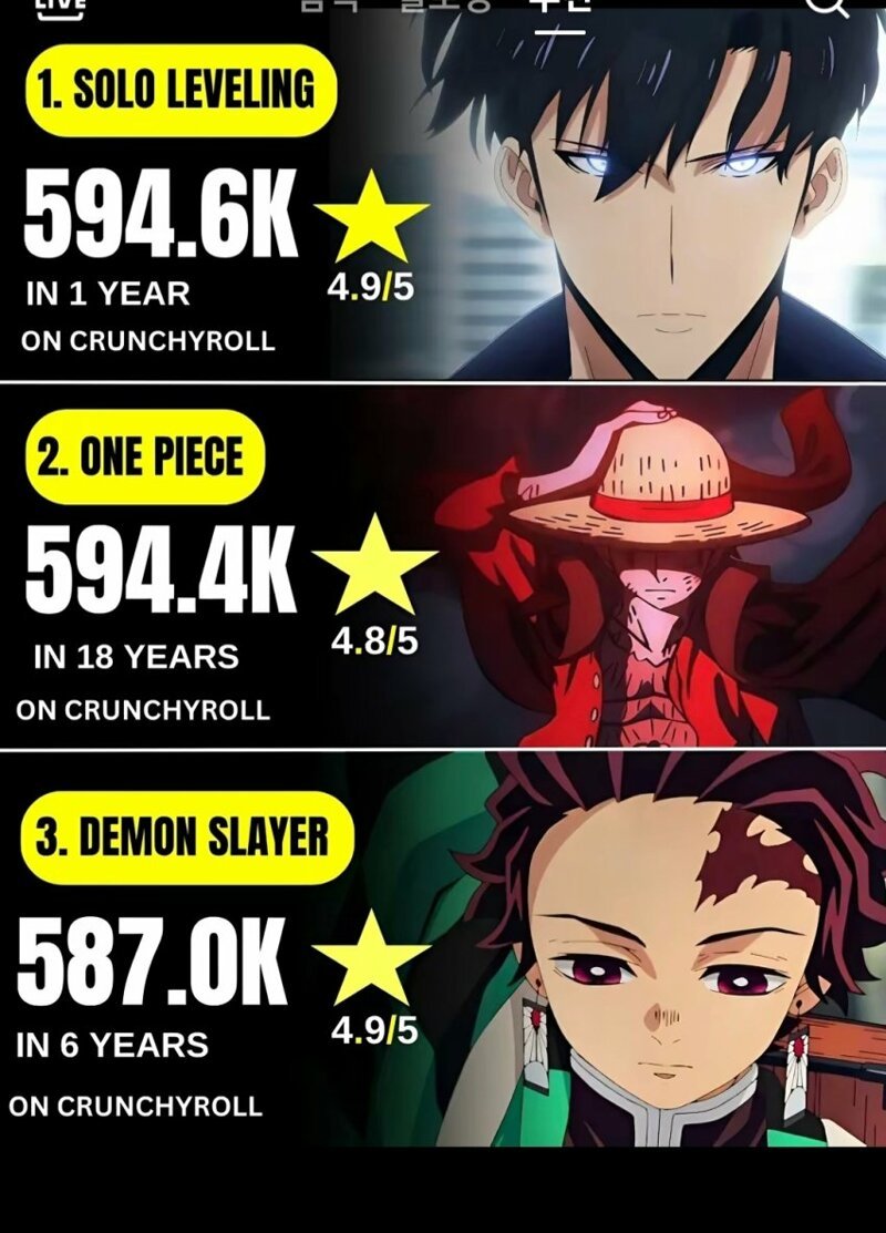 오랜 시간 1위를 지켜오던 원피스가 2위로 내려앉고, 그 자리를 나 혼자만 레벨업이 대신한 것이다. 한국 웹소설을 원작으로 한 이 애니메이션이 글로벌 팬들에게 선택받았다는 사실은 충분히 놀라웠다. 자랑스러우면서도, 어쩐지 나는 조금 낯설었다.