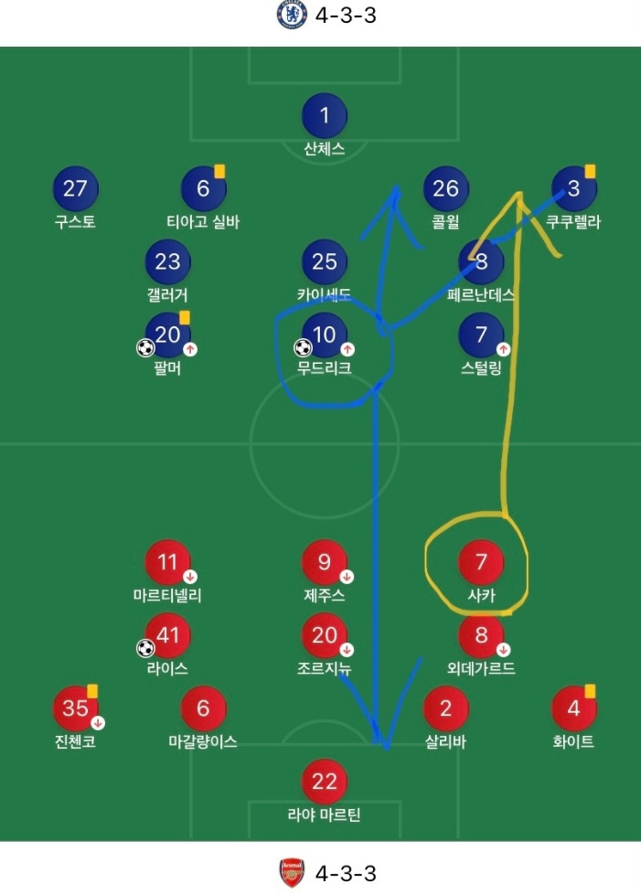 생각보다 전반 초반부터 첼시가 밀어붙였다. 4-3-3 포메이션으로 나왔지만 경기는 4-4-2처럼 보였다. 사카가 공격을 하려고 올라가면 엔소와 쿠쿠렐라에 무드릭까지 사카를 밀착수비하고 첼시 진영에서 첼시 선수가 공을 뺏으려고 하는 순간 무드릭이 엄청난 스피드로 달려 나갔다. 포체티노가 들고 온 시나리오는 꽤 괜찮아 보였다. (오오! 이것이 포체티노의 영향력인가!)