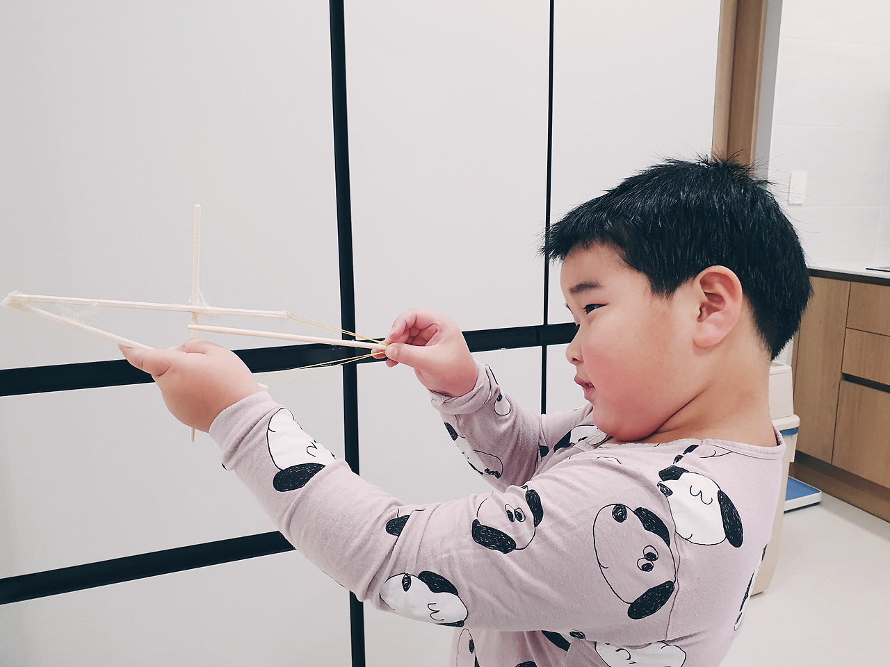 한쪽 눈을 감고 고무줄과 나무젓가락으로 만든 총으로 과녁을 향해 쏜다.