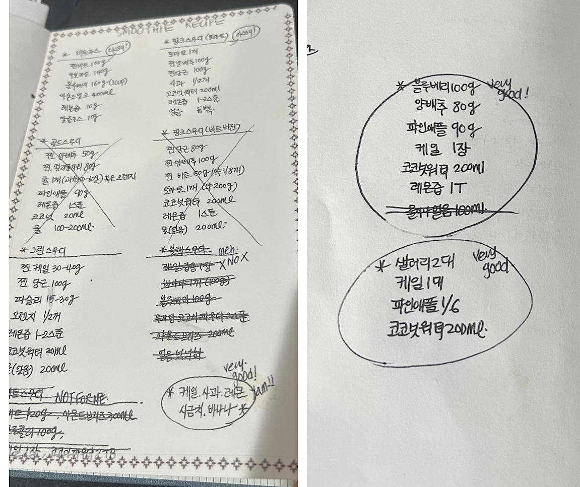 스무디의 레시피를 찾아보고 테스트하는 과정은 재미있는 실험이었다. 물론 실패도 있었지만 말이다. 예를 들어 초코 파우더를 넣은 조합은 ‘건강한 프로틴쉐이크 맛’이라고 하던데, 우리 둘다 ‘그 프로틴 쉐이크 맛’을 좋아하지 않았다. 남편은 인공적인 향에 예민한 편이라 더 그랬을 것이다. 평소엔 뭐든 잘 먹는 남편이 “이건 좀 안어울리는거 같다..”하는 걸 보면 정말 아니었지 싶다. 결국 초코 파우더가 들어간 레시피는 전부 탈락.