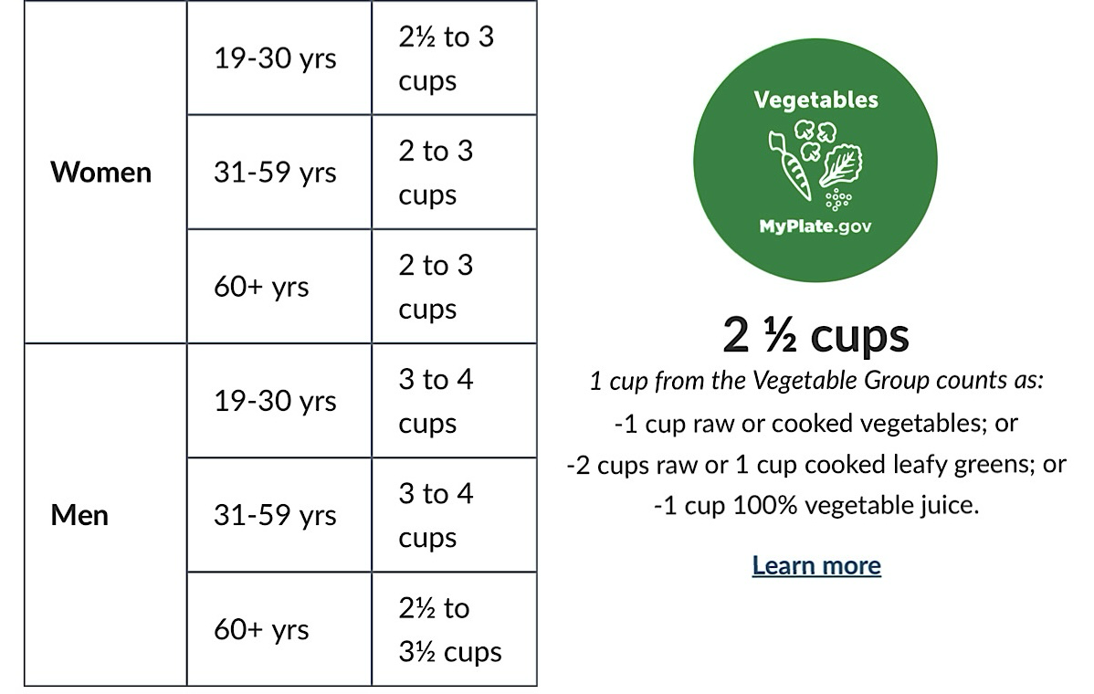 Myplate라는 정부 웹사이트에서는 나이, 성별, 체중, 활동량을 입력하면 개인별 권장 섭취량을 계산해준다. 나는 하루에 약 2컵 반 정도 섭취하라는 결과를 받았다.