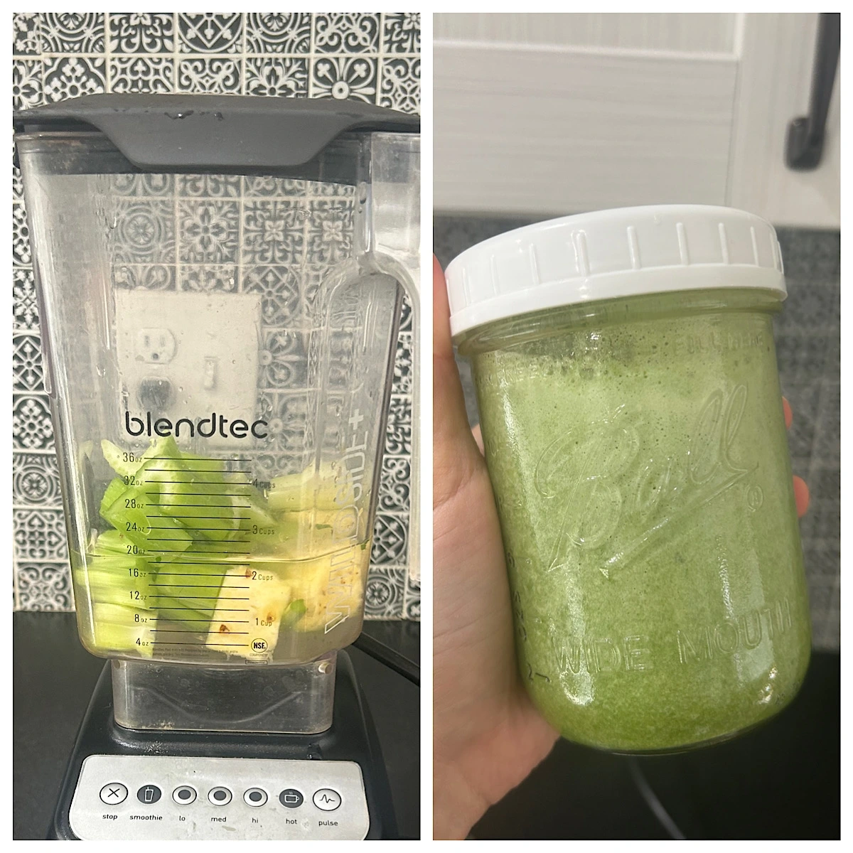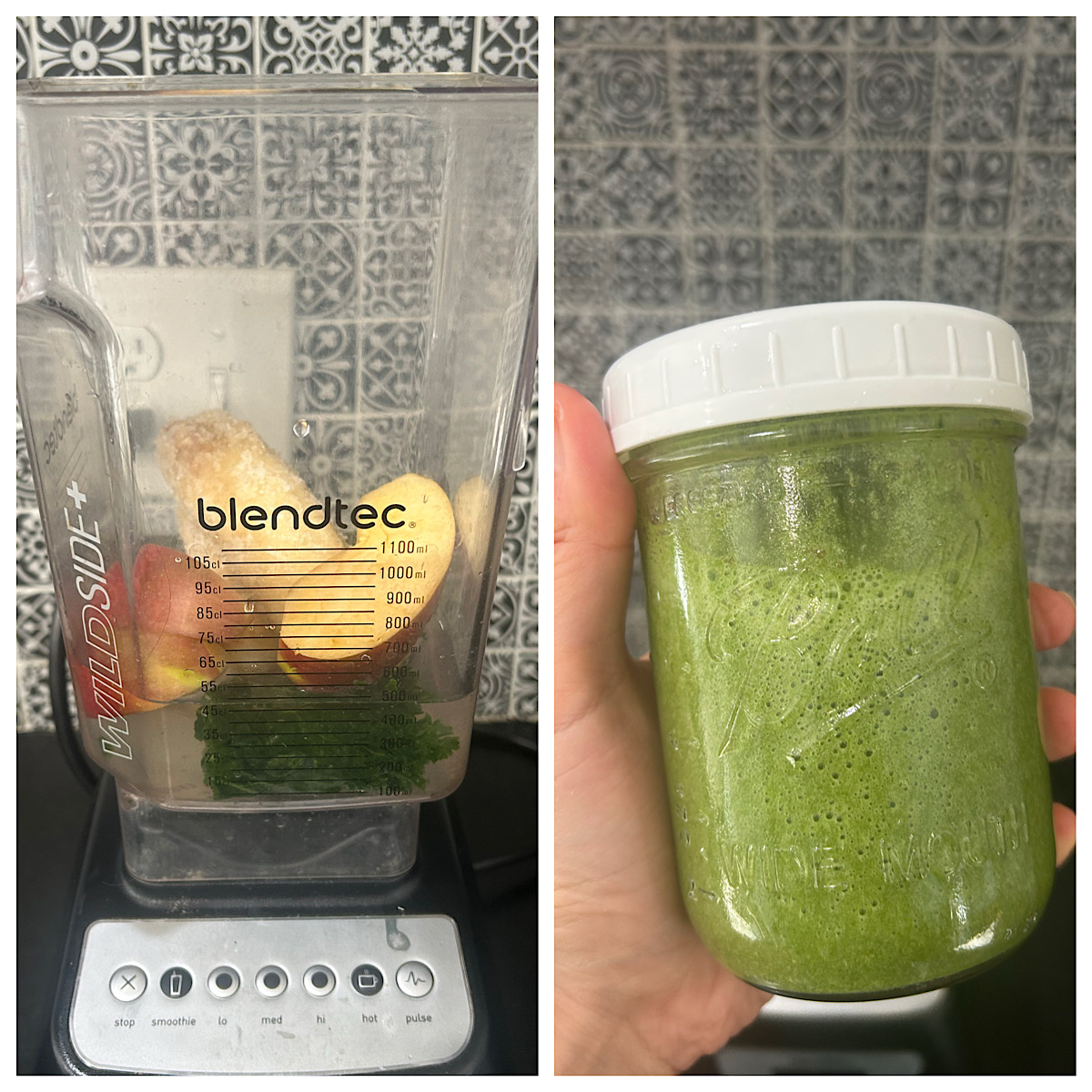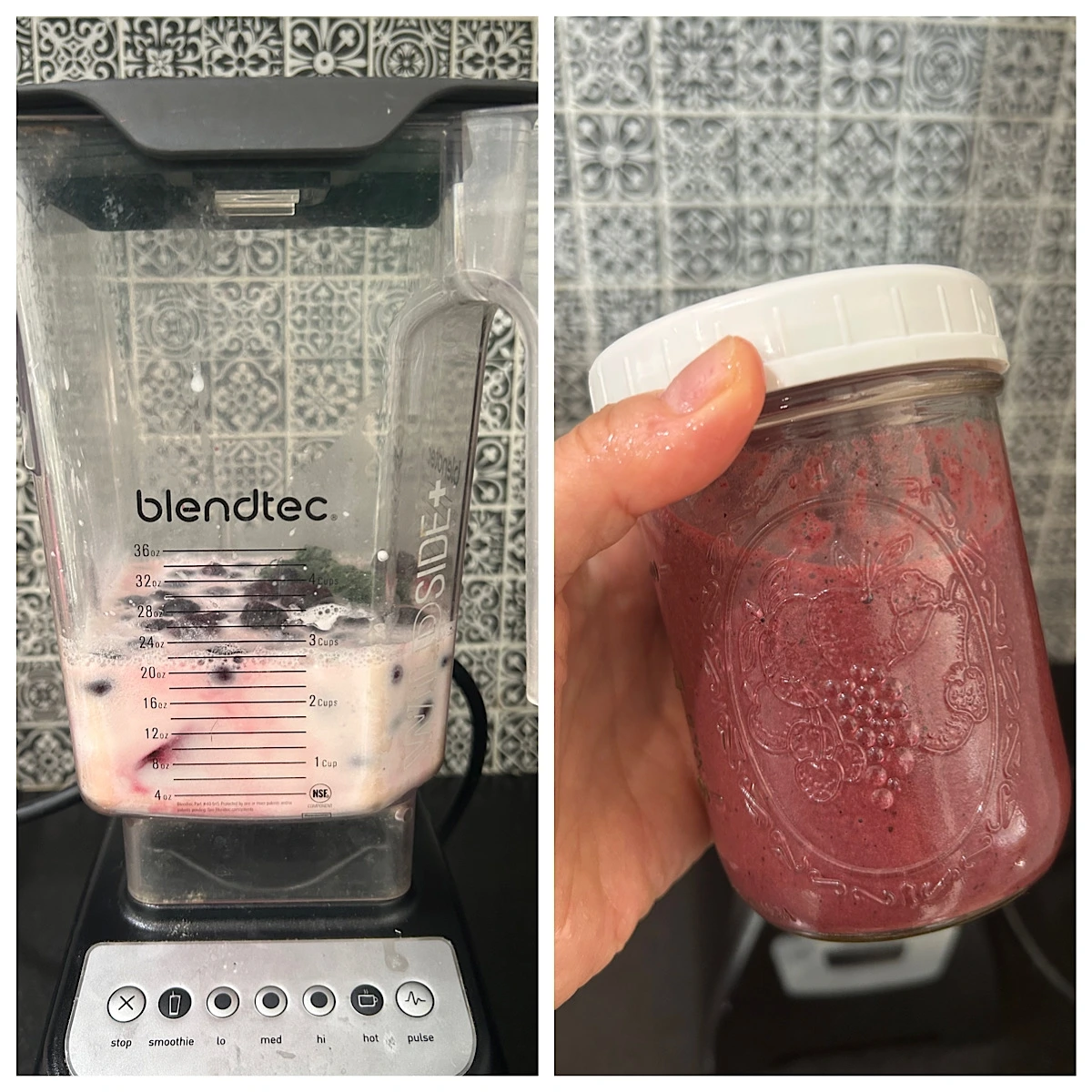 식사대용으로 마실 땐 프로틴 파우더나 피넛버터를 넣기도 하지만, 우리는 주로 식전에 마셔서 거의 빼고 있다. 우리가 자주 만드는 조합은 다음과 같다. 두 잔 분량으로 남편과 나눠 마신다.