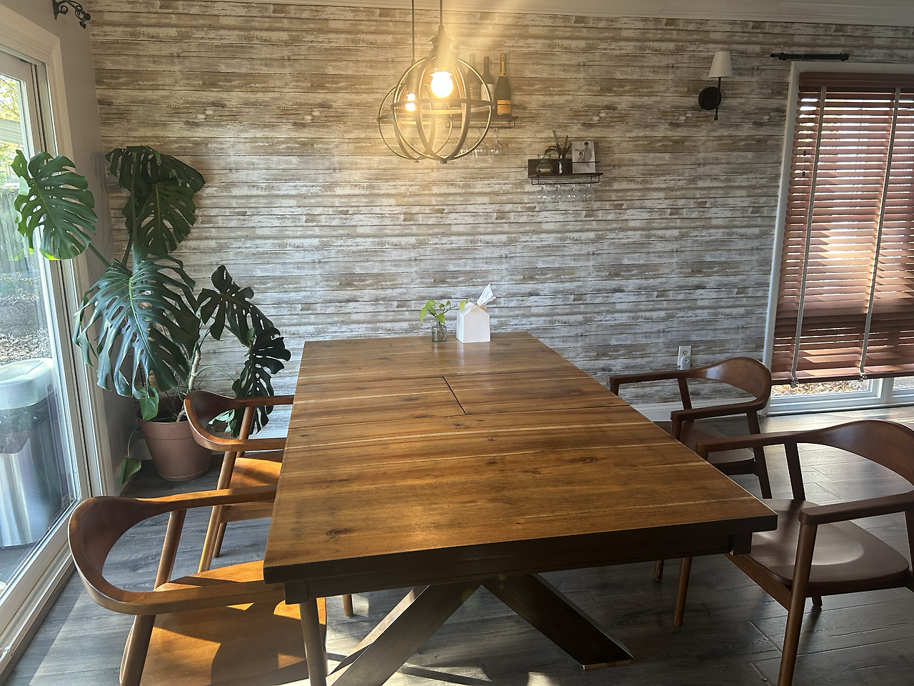 아무튼 그렇게 남편의 피땀눈물로 완성된 식탁은 다이닝룸에 자리를 잡았다. 흔하지 않고 나무결과 손의 수고가 그대로 남은, 말그대로 세상에 하나밖에 없는 식탁이 되었다. 내가 상상했던 식탁과는 조금 다르지만 남편의 땀과 정성이 필터를 씌운것 같다. 좀 짠하기도 하고 웃기기도 하고 어쨌든 확장형은 확장형이고, 원목이고 나름 주방 벽과도 잘 어울린다. (아직 신혼이라 가능한 필터일지도 모른다)