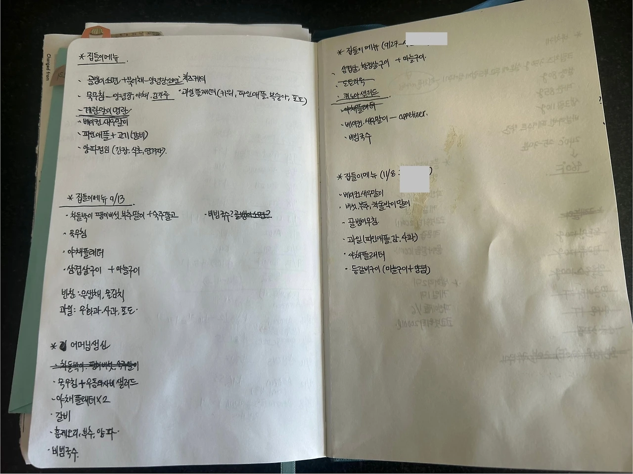 메뉴를 고르다 보면 남편의 세심함을 새삼 느낀다. 유학생 친구에게는 집밥이 그립지 않을까 싶어 김치로 한 요리를 넣고, 쉼이 부족한 직장인 동생들에게는 고기를 넉넉하게 굽는다. 아이가 있는 가족이면 매운 음식을 빼고 간도 약하게 조절한다. 대단한 상차림은 아니지만 이것저것 동시에 차리려다가 보면 준비해 놓고도 빠트리기 쉬워서 그날의 메뉴를 적어두고 체크하는 습관도 생겼다.