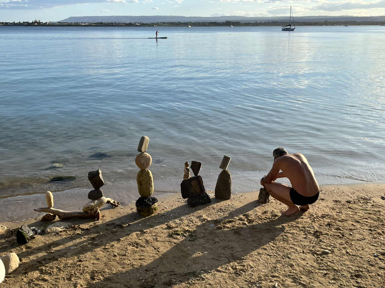 돌 쌓기를 예술로 승화시킨 이 아저씨는 매일 해변에 오는 10명 정도의 고정 멤버 중 한 명이다. 매일 비슷한 시간에 도착해서 서로 눈웃음으로 맞이하며, 내적 친밀감을 갖게 되었다. 아저씨는 예술적 혼을 담아 돌을 쌓고 탑을 만들었다. 돌 쌓기의 성공의 열쇠는 잘 쌓을 수 있는 돌을 고르는 것에 있는 것인지, 그는 많은 시간 해변을 돌아다니며 적당한 돌을 찾는데 공을 들였다. 그 후에는 엄청난 집중력으로 하나하나 쌓아간다. 금방 쌓을 때도 있지만, 30분 넘게 돌 하나를 올릴 때도 있었다. 늘 마무리는 작품 앞에 걸터앉아 석양을 배경으로 자신의 작품을 지긋이 감상하는 것으로.