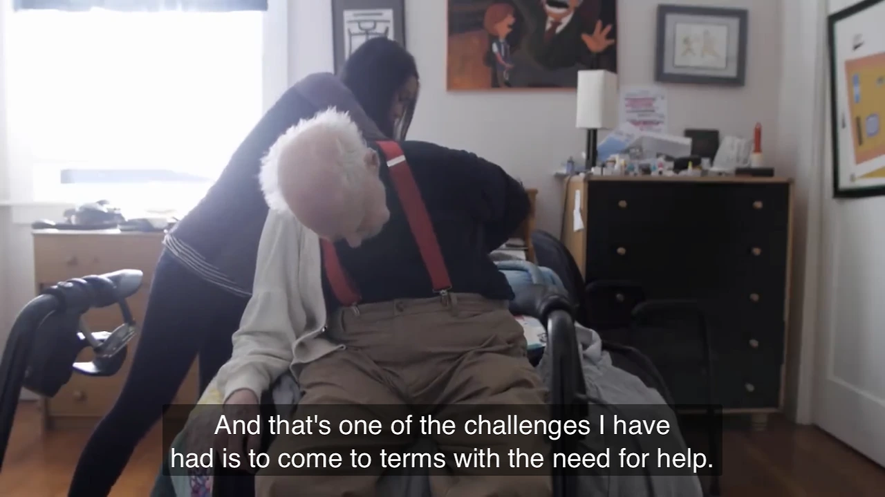 일상의 작은 일조차 타인의 도움이 필요해진 사람의 기분과 그 내면의 심리에 대해서, 온전히 자기 힘으로 살아갈 수 있는 젊은 사람들은 절대 이해하지 못할 것이라고 그는 말한다. 내레이션으로 흘러나오는 그의 목소리에는 자기 연민도, 슬픔도 담겨있지 않은 담담함이 느껴진다.