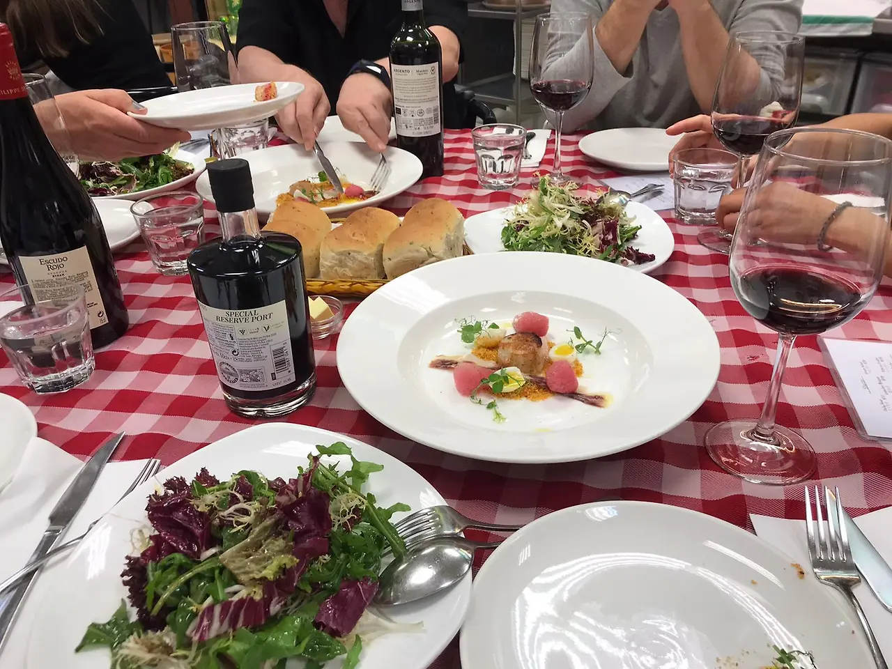 우리는 음식에 곁들여 각자가 가져온 서로 다른 와인을 맛보았다. 대부분이 유럽 친구들이라 음식과 페어링을 하면서 와인의 취향을 가꾸어왔기 때문인지, 자신의 와인 취향을 잘 설명할 줄 알았다. 맛있게 식사를 마치고는 디저트까지 먹었다. 식사 내내 서빙해 주시는 직원들은 유머러스했고, 와인 잔이 비기 전에 친절하게(그리고 인심 좋게) 와인을 따라주셨다. 마지막에 디제스티보를 위해 우리가 포트 와인을 가져온 것을 보고는, 와인잔을 바꿔서 작은 포트와인 잔으로 세팅해 주셨다. 세심한 서비스에 너무 고마워서 우리들은 이 귀한 포트와인을 우리끼리만 마실 수 없다며, 직원분들의 잔도 부탁드렸다. 셰프 분들까지 밖에 나와서 다 같이 ‘치어스'를 외치며 함께 식후주를 즐겼다.