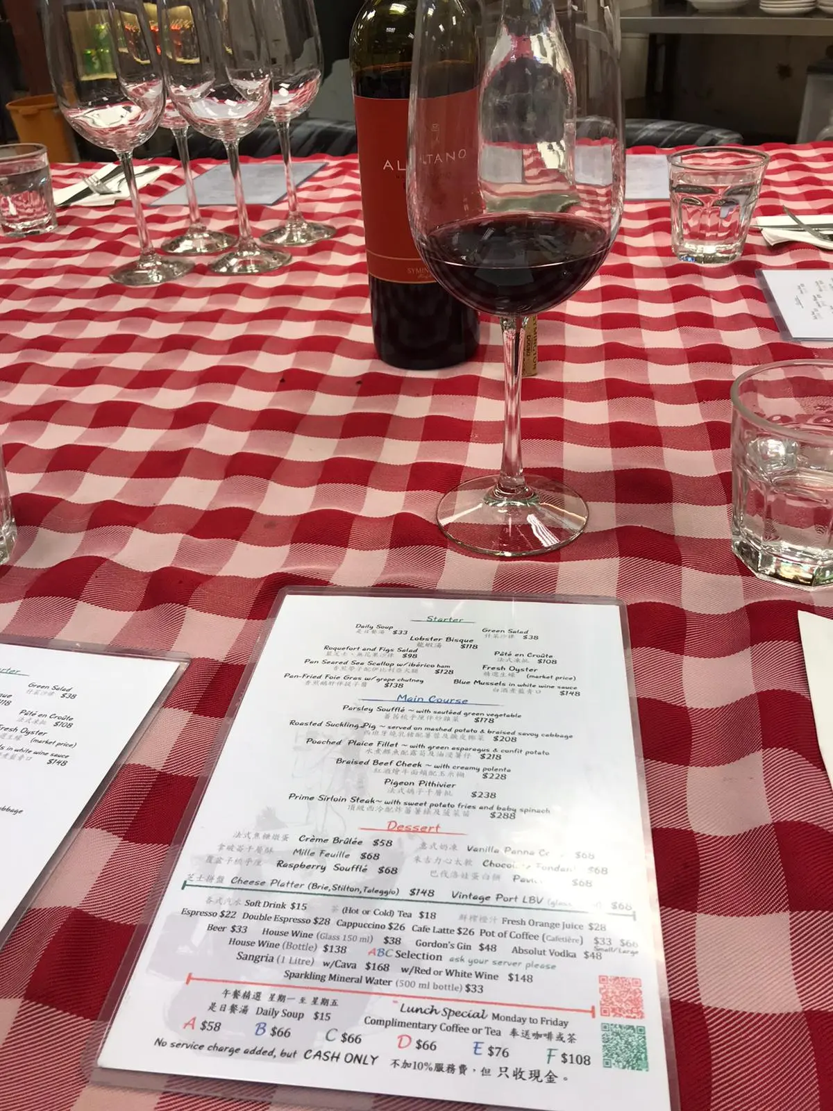평일 저녁이었는데도 예약 없이는 자리를 잡기 어려울 만큼 꾸준히 사람들에게 사랑을 받고 있는 듯했다. 예약된 테이블로 우리를 안내해 준 서버는 가져온 와인이 있는지 묻고, 바로 서빙을 해주셨다. 우리는 자리마다 놓인 오늘의 메뉴를 훑어보았다. 돼지 바비큐 roasted suckling pig와 스테이크가 이곳의 시그니쳐 메뉴이고, 이외에도 생선과 시푸드도 시즌별로 준비가 된다. 우리는 각자 메인 메뉴를 고르고, 다양한 전채요리를 시켜서 셰어 하기로 했다.