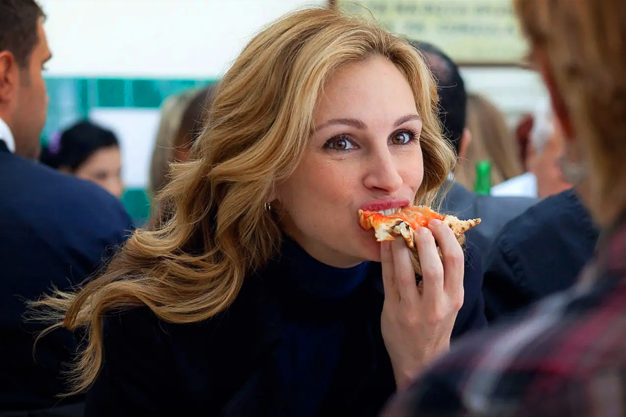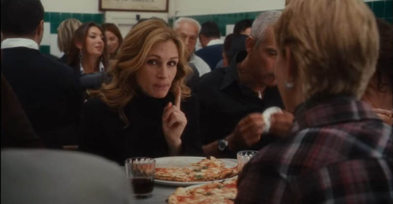 하지만 앞에 앉은 친구는 울상이다. 바로 이 피자 때문에 몸무게가 늘었고, 입던 청바지가 잠기지 않는다며. 줄리아 로버츠는 까짓것 내일 같이 새로운 청바지를 사러 가면 되지 않냐고, 지금 이 사랑스러운 피자를 즐기는 것보다 더 중요한 것은 없다고 열변을 토한다.