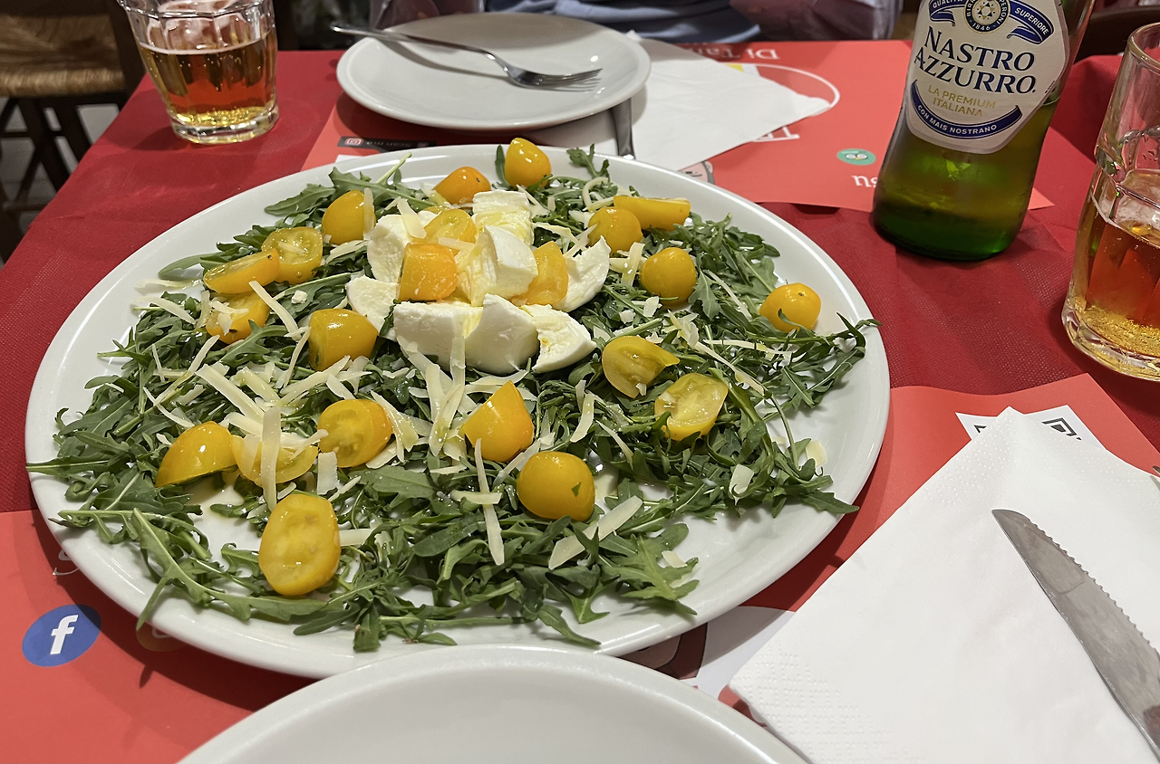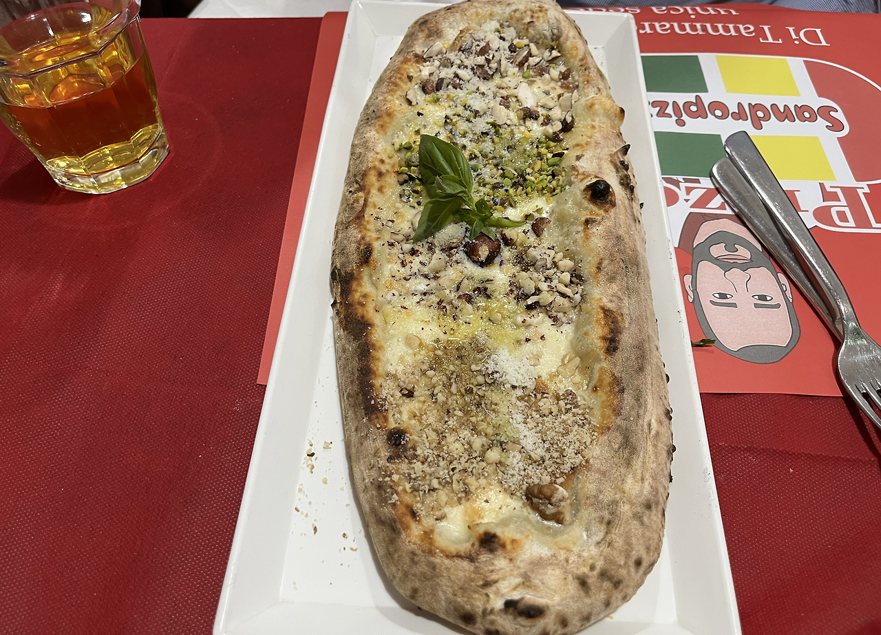 이중에서도 나의 원픽은 지나가다가 충동적으로 들어간 동네의 작은 피자집이다. 저녁 시간에 동네를 걷다가 왠지 느낌이 좋아 보여서 한번 모험을 해볼까 하며 들어갔던 곳이었다. 영어 메뉴는 없었고, 직원은 당연하다는 듯 이탈리아어로 메뉴를 설명해 주었다. 우리는 마가리따 피자와 오메가 3 피자라는 신기한 메뉴를 골라봤다. 올리브오일 베이스에 모짜렐라 치즈와 세 가지 견과류 (호두, 아몬드, 피스타치오)가 올라간 피자라서 오메가 3이라고 부른다고 했다.