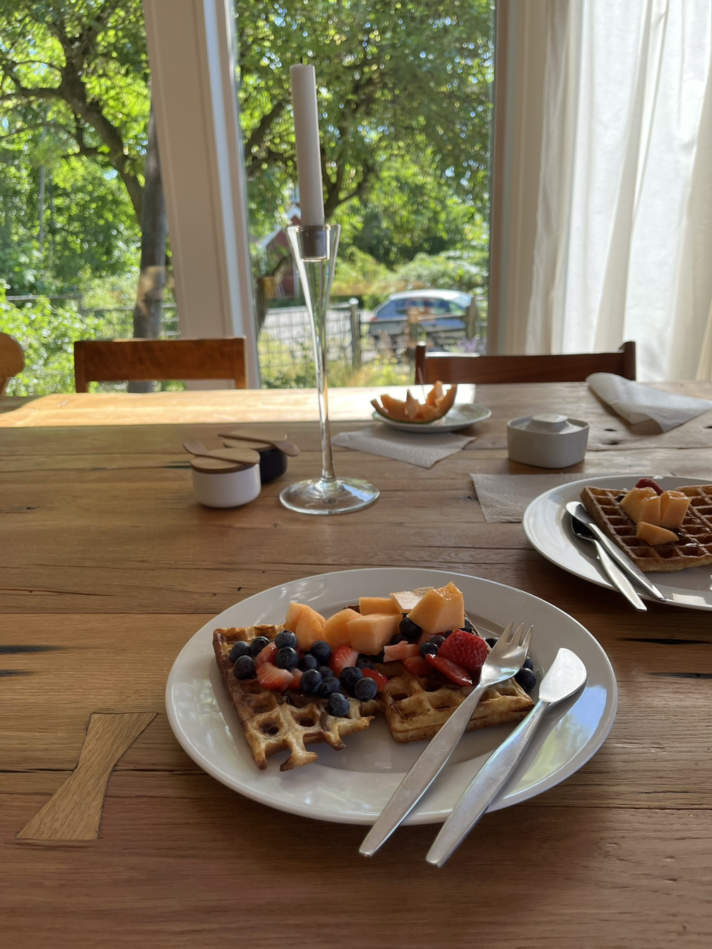 호스트인 J가 우리에게 아침을 뭘 먹을지 물어본다. 아침에 아이들이 와플 메이커로 와플을 만들어 먹는 걸 좋아해서 몇 개 구웠다며 먹을지 묻는다. 와플 두 조각 위에 허니와 누텔라를 바르고 과일을 잔뜩 올려서 내주었다. 제철을 맞은 블루베리, 라즈베리, 딸기가 입안에서 달콤하게 녹아내렸다. 복숭아를 넣은 요거트볼을 곁들여 먹었다.
